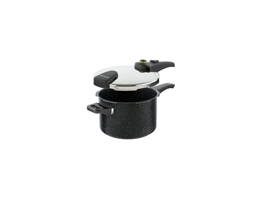 Tlakový hrnec z nerezavějící oceli BLACK GRANITEC s oboustranným nepřilnavým povrchem se vyznačuje snadnou obsluhou, jednoduchou údržbou a dlouhou životností.