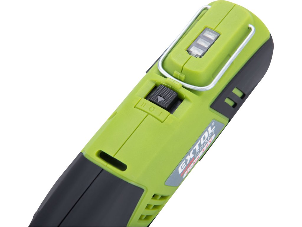 Aku minibruska je určena k jemnému broušení, odhrotování, frézování, gravírování, leštění a k jemnému vrtání otvorů. Nízká hmotnost, bateriový pohon, malé rozměry, ergonomicky tvarované tělo a gumové úchopové části umožňují příjemné držení a snadnou manipulaci při práci. Díky novému USB konektoru je možné brusku nabíjet z běžné USB nabíječky, počítače nebo powerbanky a díky tomu lze neomezeně používat i v místech kde není proud. Li-ion akumulátor umožňuje aku brusku kdykoliv dobíjet, aniž by se tím snižovala kapacita akumulátoru. Li-ion akumulátor ztrácí energii vlivem samovybíjení velmi pomalu a vydrží dlouho nabitý.