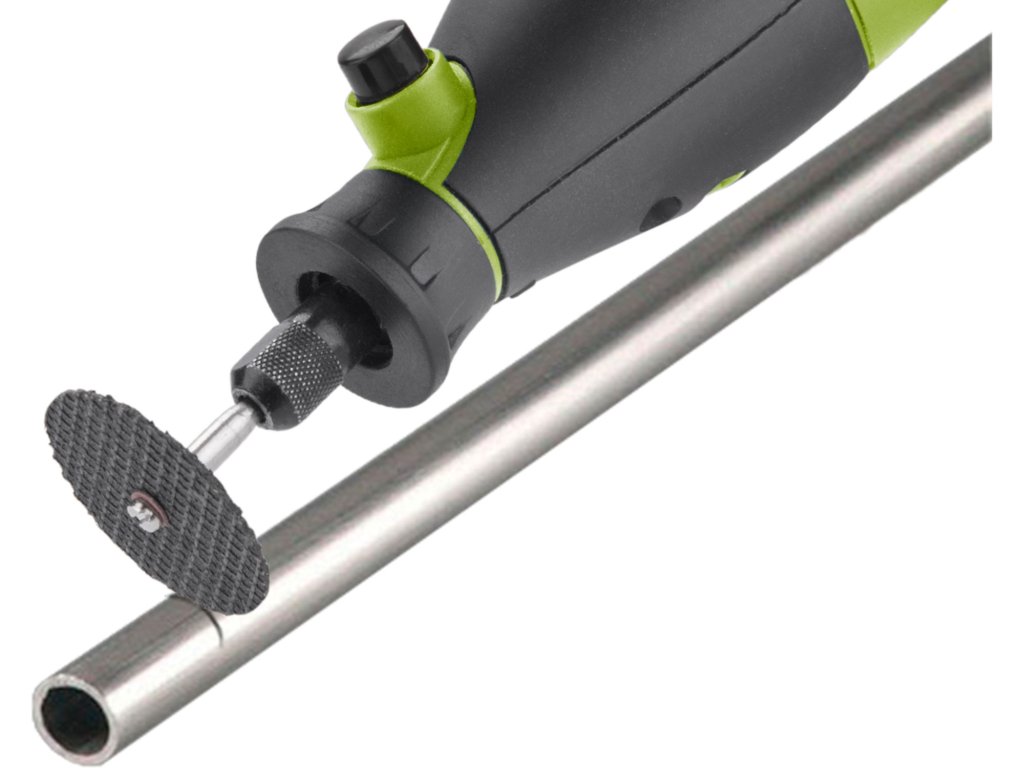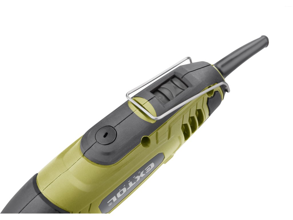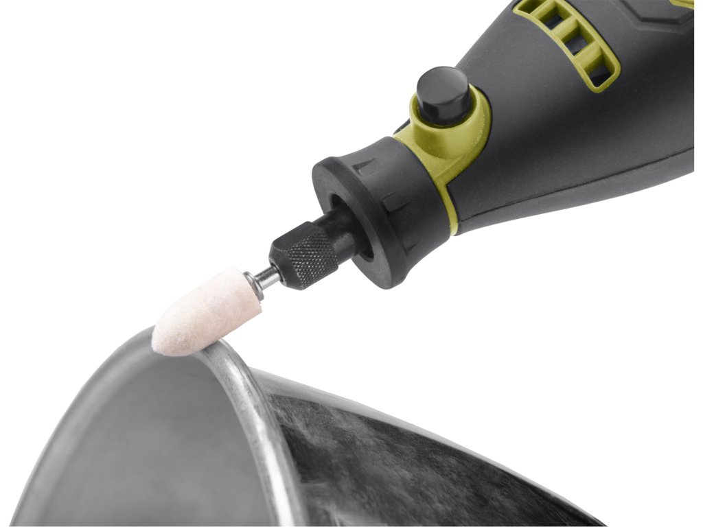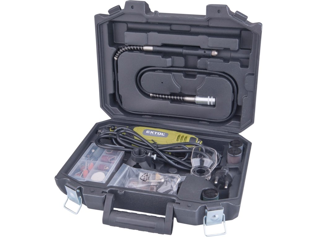 Malá bruska s řadou nástavců, určená k jemným gravírovacím pracím, preciznímu opracování dřeva, kovu či plastů a práci ve stísněných prostorech. Má ergonomický tvar a je pokrytá gumou v místech úchopu, což snižuje únavu při práci. Stroj umožňuje výměnu a montáž upínacích kleštin pro uchycení nástrojů s průměrem stopky 3 nebo 3,2 mm. Součástí balení je sada 210 kusů brusných a řezacích nástrojů a nástavců. Pro velmi jemnou a drobnou práci je u brusky ohebný nástavec.