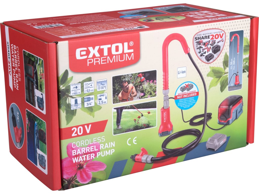 Aku čerpadlo do sudu je určeno pro čerpání čisté vody ze sudů s dešťovou vodou a díky své výtlačné výšce 21m dostane vodu na celou plochu domácí zahrady i v případě, že má vysoké převýšení. Se sudovým čerpadlem odpadá nošení těžkých konví s vodou pro zalévání na zahradní hadici lze totiž připojit různá zavlažovací a kropící/ zalévací příslušenství a s použitím kropítka na tyči lze komfortně zalévat květiny v květináčích ve výšce, rosit květiny mlhou nebo s použitím kropícího příslušenství pro zalévání trávníku lze tak k zalévání trávníku použít dešťovou vodu. Aku verze navíc umožňuje používat čerpadlo v místech kde není přístup k elektrické energii. Čerpadlem projdou pevné nečistoty o maximální velikosti 0,5mm. Na výstupu čerpadla je flexibilní hadice s ventilem, kterým lze upravit průtok vody dle potřeby a běžná rychlospojka na kterou si můžete jednoduše připojit co potřebujete. Pro zjednodušení obsluhy má čerpadlo na výstupu hadici s hákem a lze ho zavěsit do sudu. Čerpadlo je určeno k čerpání čisté užitkové vody bez obsahu jakéhokoli mechanického znečištění. Baterie je uložena ve vodovzdorném krytu s hákem pro zavěšení. Pro běžnou práci dostačují jeden nebo dva 2Ah akumulátory, které můžete rychle nabít v rychlonabíječce, pro náročnější nebo delší práci doporučujeme větší akumulátory s kapacitou 4–8Ah. Akumulátor lze použít ve všech typech nářadí řady EXTOL SHARE20V. Díky použité Li-ion technologii je ho možné kdykoliv dobíjet, aniž by se tím snižovala jeho kapacita. Li-ion akumulátor ztrácí energii vlivem samovybíjení velmi pomalu a vydrží dlouho nabitý a připravený k použití.