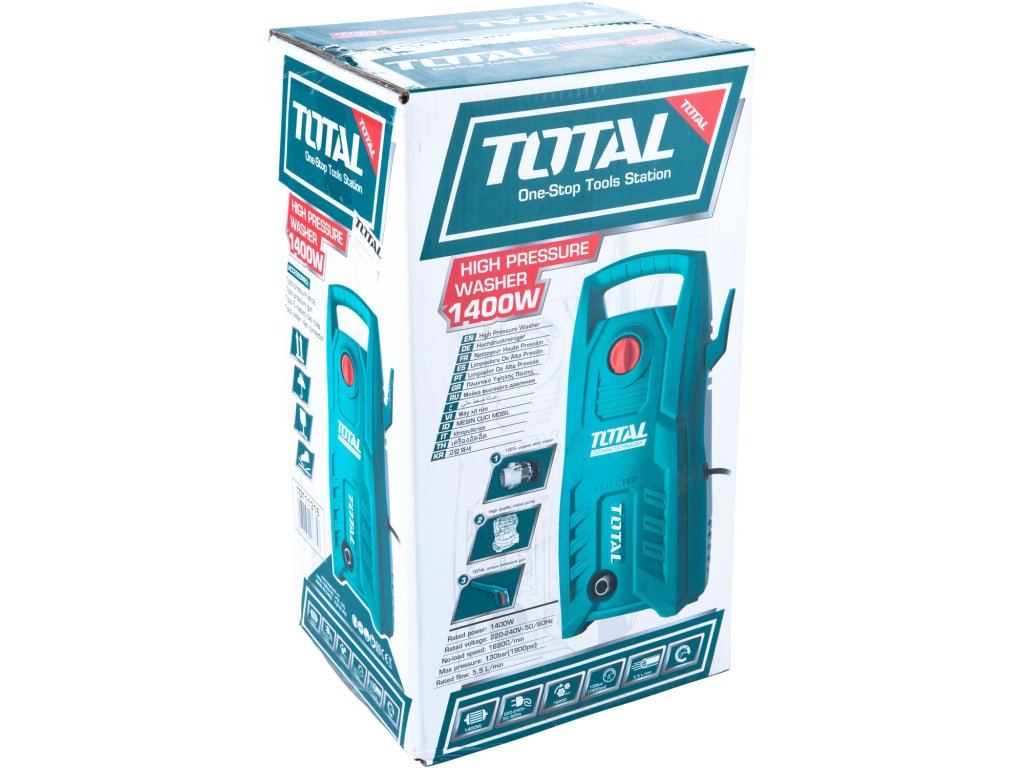 Tento malý a všestranný vysokotlaký čistič je určen k čistění povrchů a ploch z kamene, dřeva, kovu, plastu. Hlavní uplatnění nachází tento výrobek při mytí dopravních prostředků, při čištění chodníků, teras, fasád domů, zahradního nářadí, odstraňuje mech a řasy apod., přičemž se využívá zejména účinku vysokého tlaku vody, který je dostačující pro většinu čistících úkonů. Díky 5m dlouhé hadici nemusíte čistič stále posouvat. Čistič má 1400W, tlak 130barů, s průtokem vody 5,5l/min a váhu 5,3kg. Je vybaven auto-stop systémem pro vypnutí motoru při přerušení práce, pojistkou na stříkací pistoli a nastavitelnou tryskou na seřízení rozptylu vody pro plošné čištění. Patentovaný design TOTAL.