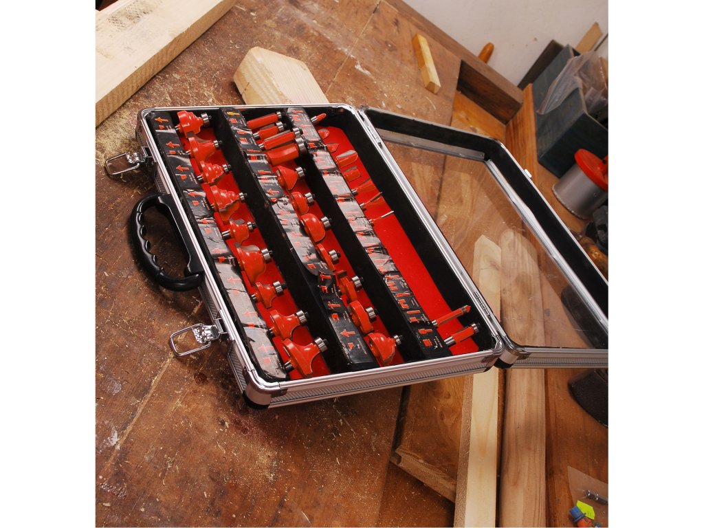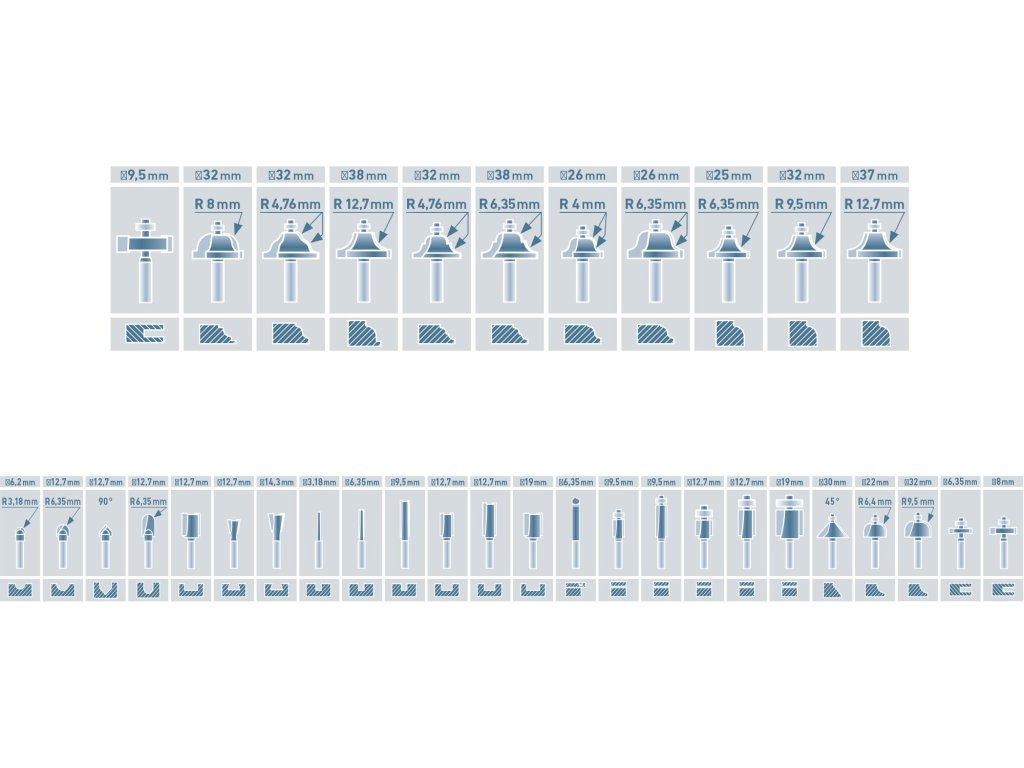 - frézy opatřené řezacím břitem z tvrdokovu, vodicím kolečkem s kvalitním ložiskem a upínací stopkou o průměru 8mm