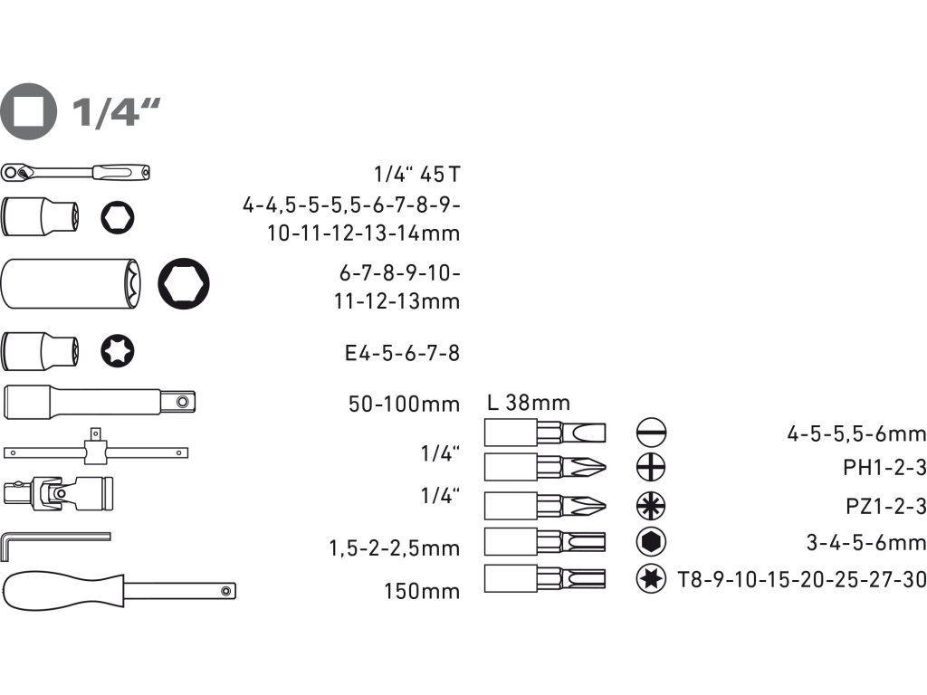 hlavice nástrčné: | 1/4": 4-4.5-5-5.5-6-7-8- 9-10-11-12-13-14mm |
