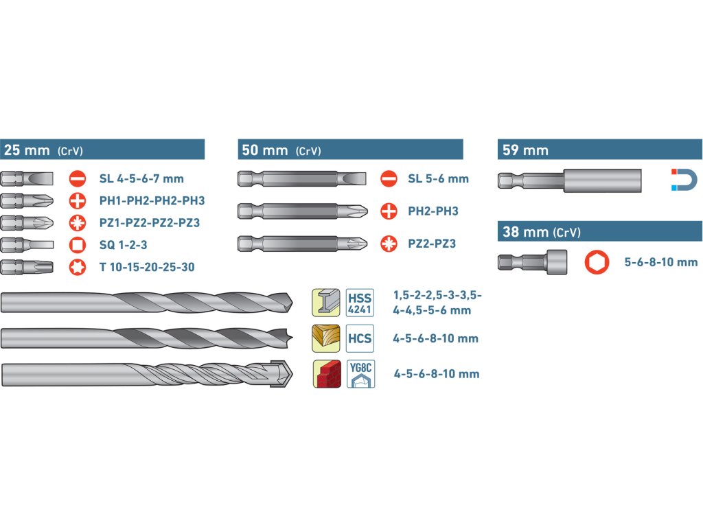 | doplňující parametr: | vrtáky do kovu(HSS-4241) : O 1,5-2-2,5-3-3,5-4-4,5-5-6mm; vrtáky do dřeva(HCS): O 4-5-6-8-10mm; vrtáky do zdiva(SK-YG8C): O 4-5-6-8-10mm; hroty 1/4"x25mm: (-) 4-5-6-7mm, PH1-2-2-3, PZ1-2-2-3, TORX T10-15-20-25-30, SQ 1-2-3; hroty 1/4"x50mm: (-) 5-6mm, PH2-3, PZ2-3; nástrčné hlavice (38mm): 5-6-8-10mm; magnet.nástavec na hroty 1/4"x59mm |