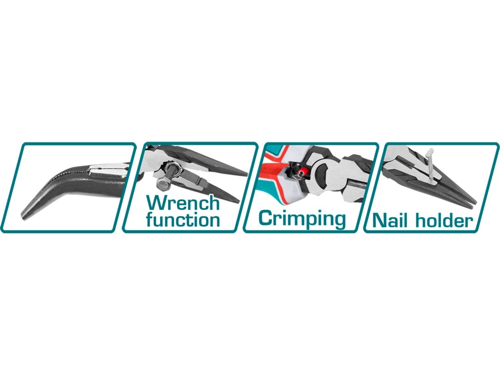 Velikost: 200 mm, Úspora energie 30 % oproti běžným kleštím, Materiál: Cr-VPovrchová úprava: černá a leštěná, TPR tříbarevná rukojeť pro pevné uchopení a pohodlí, S funkcí krimpování, S funkcí držáku hřebíků, S funkcí klíče.
