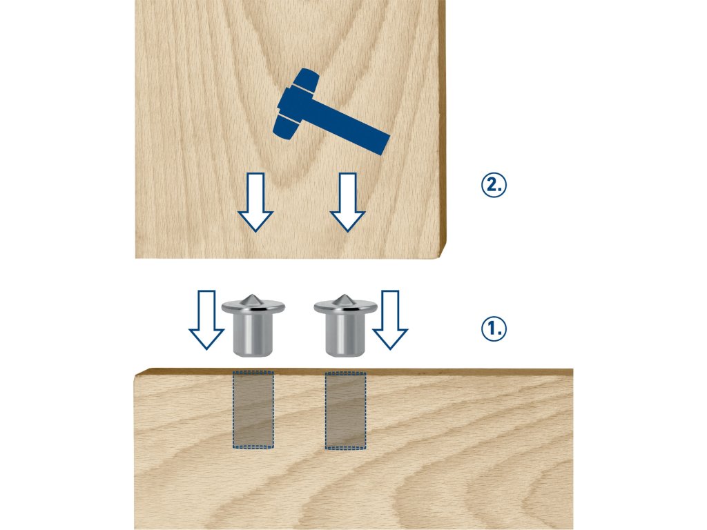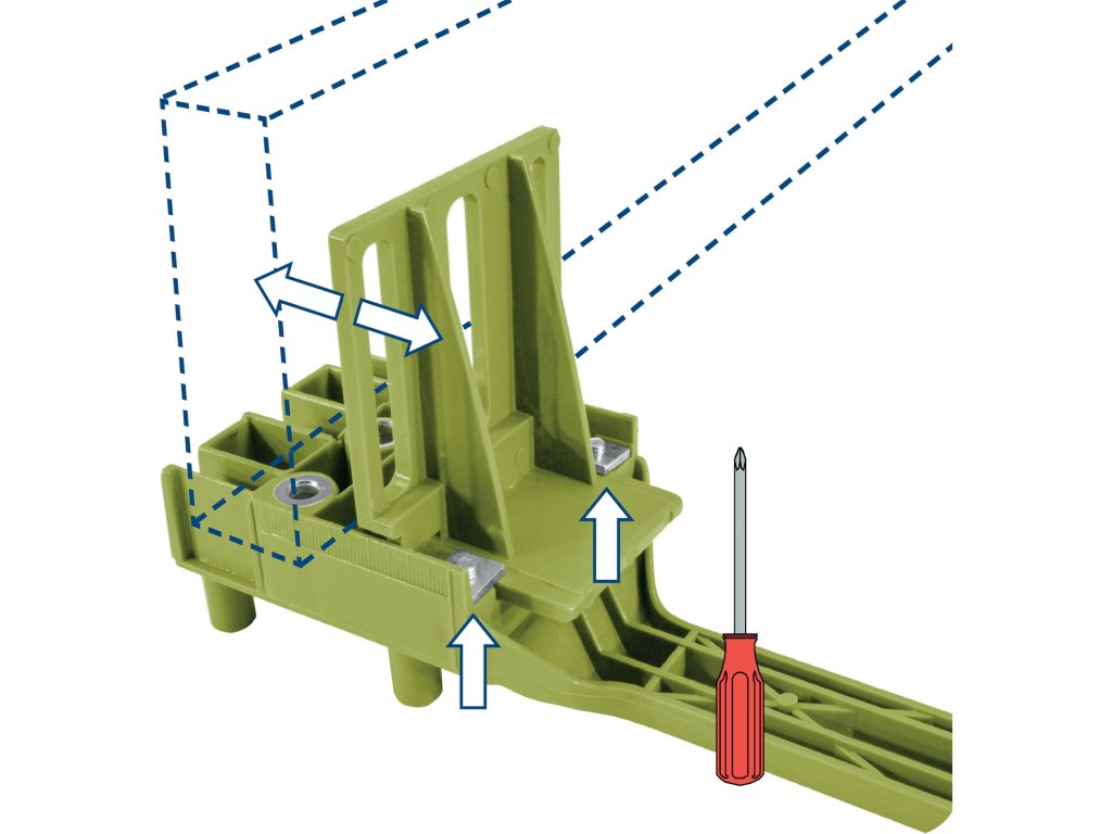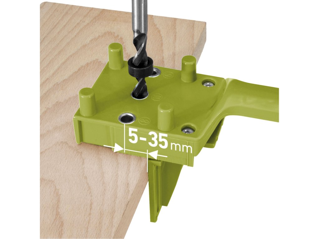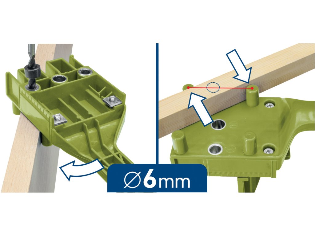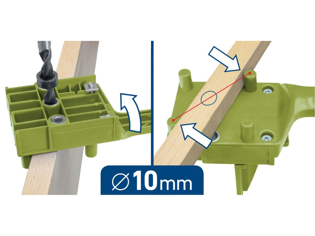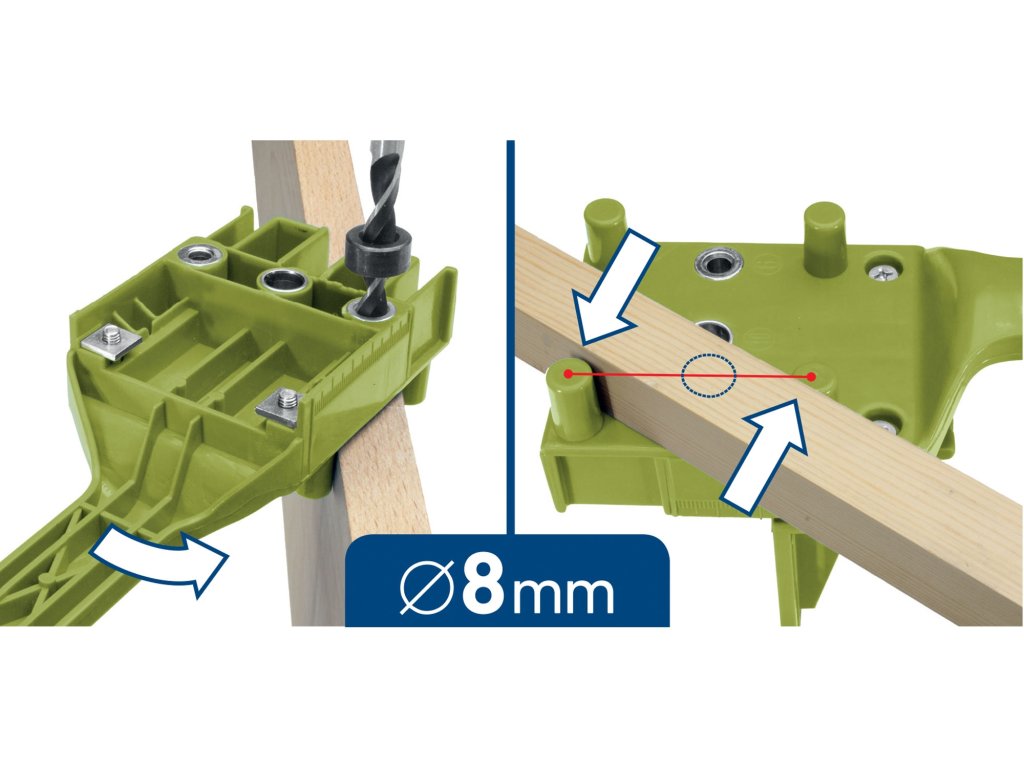 - tento kolíkovací přípravek je určen k vrtání otvorů, přesnému značení a následnému vytváření pevných kolikových spojů o průměrech 6-8-10mm pro rohové profily z dřevěných materiálů, dřevotřísky a materiálů na bázi dřeva