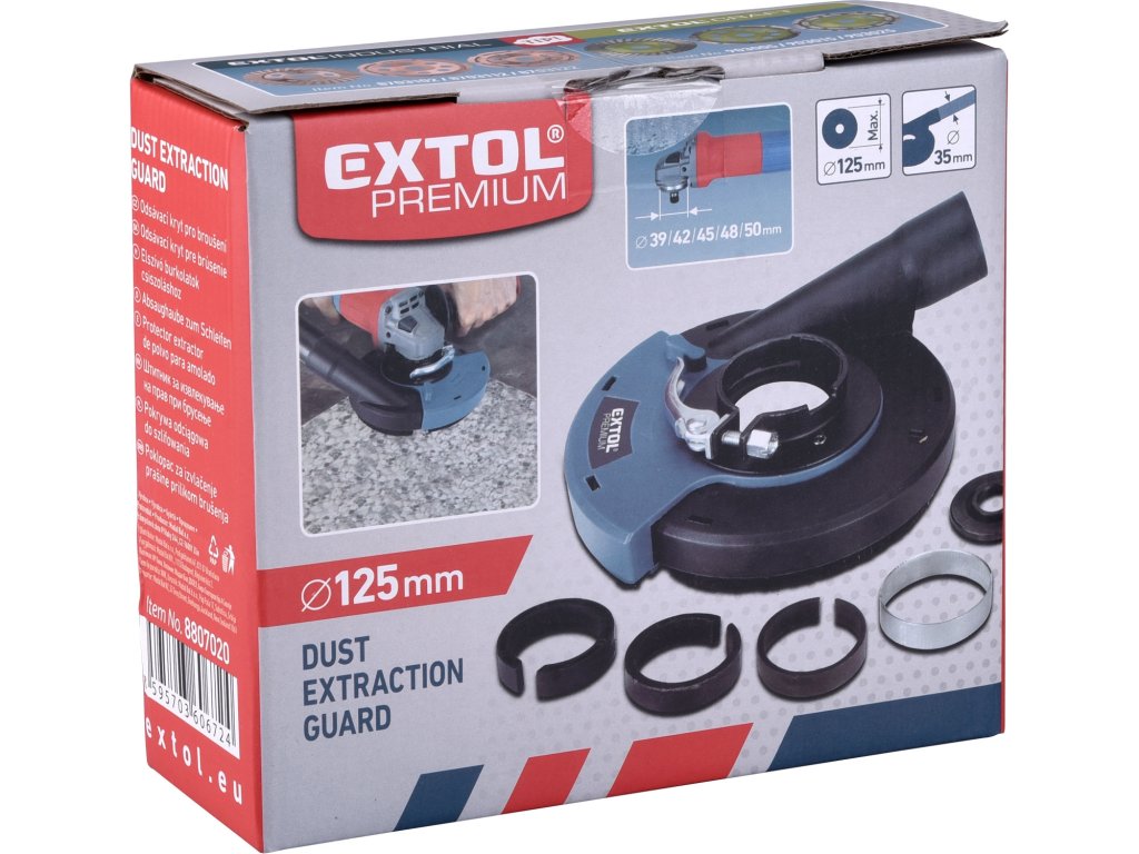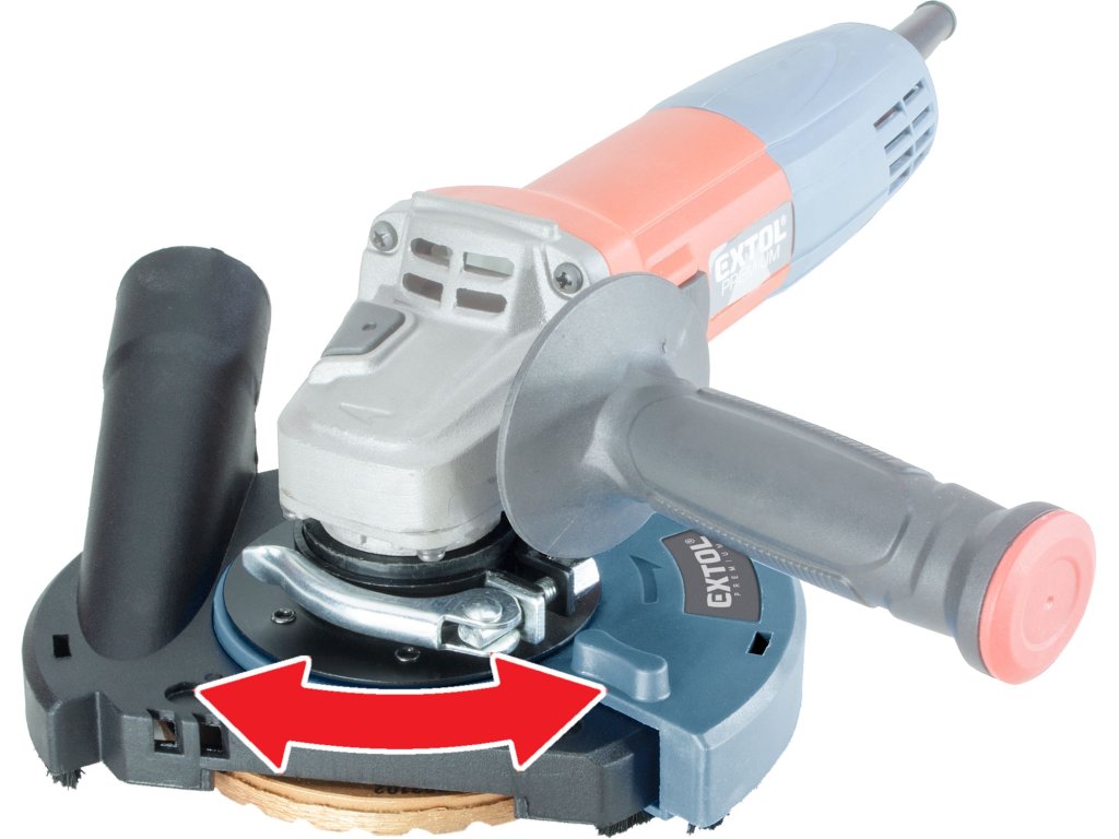 - pomocí nastavitelné fixační objímky(límce) a kombinaci dodávaných vymezovacích vložek lze tento odsávací kryt nainstalovat na všechny běžné typy 125mm úhlových brusek za použití brusných diamantových kotoučů O125mm s výškou kotouče cca 21,5mm