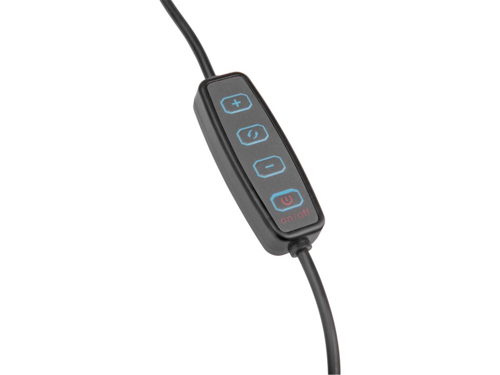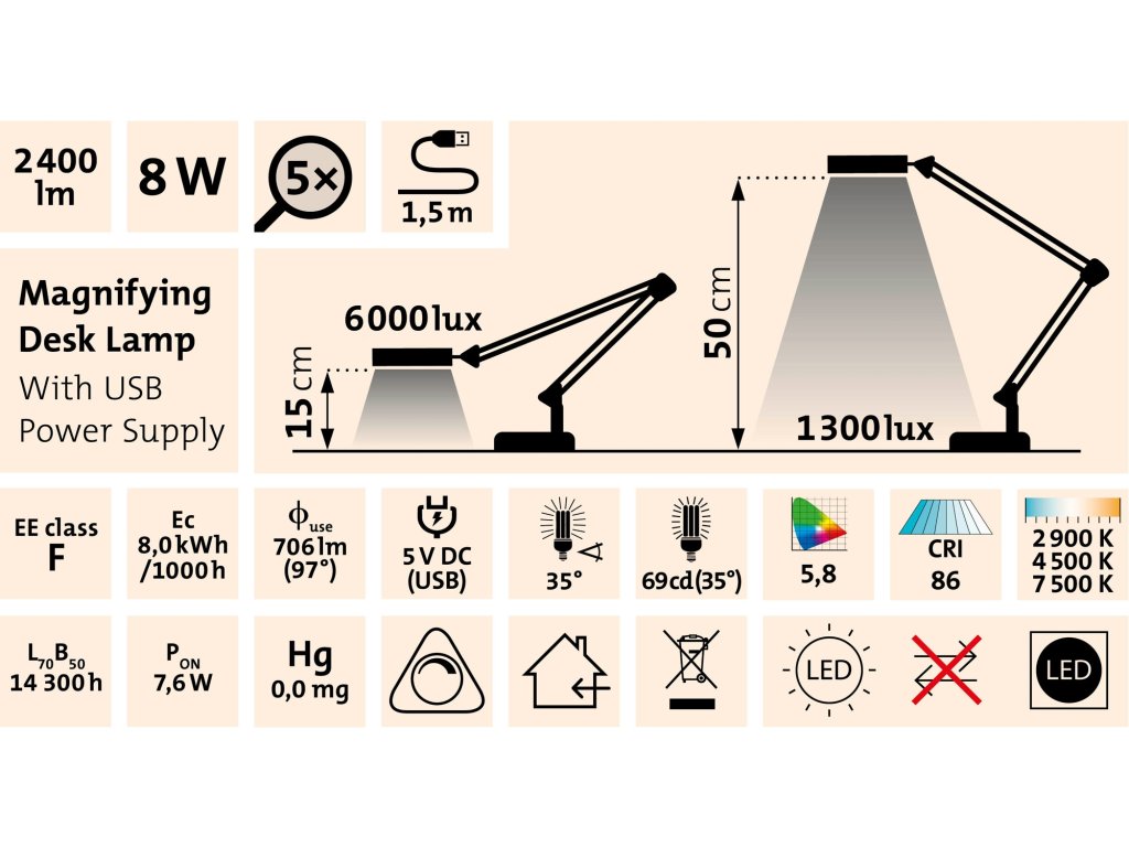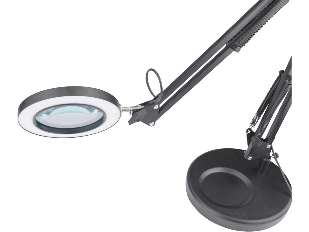 | doplňující parametr: | napájení 5V DC (USB), světelný tok – 15cm pod světlem: 9000lm, 50cm pod světlem: 1300lm, kabel 150cm, délka ramen 70,5cm, průměr lupy (skla) 10,5cm, průměr základny 19cm, hmotnost s podstavcem 2kg |