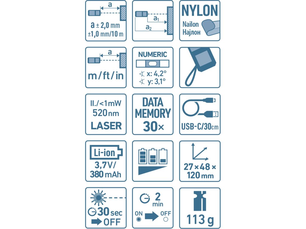 - funkce automatického vypnutí laseru po 30s, automatické vypnutí přístroje po 2min. nečinnosti chránící výdrž baterie