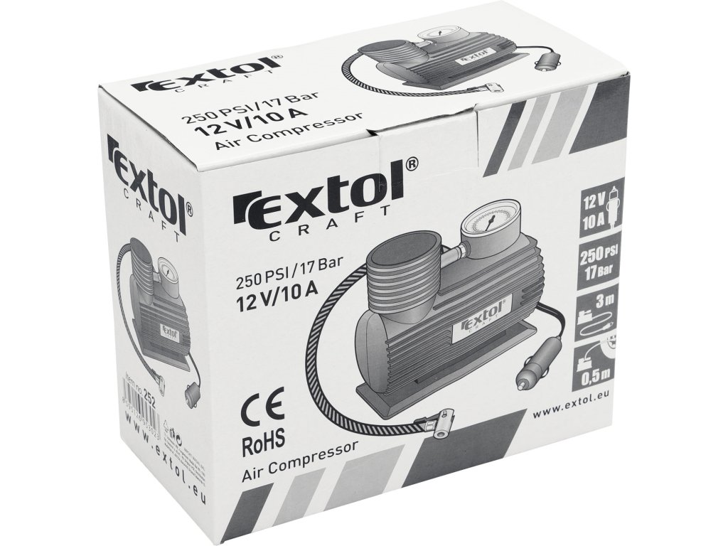 | doplňující parametr: | manometr 250PSI/1,7MPa, délka napájecího kabelu 3m,připojení do autozásuvky 12V, vzduchová hadička 0,5m, 3 typy koncovek, CE |