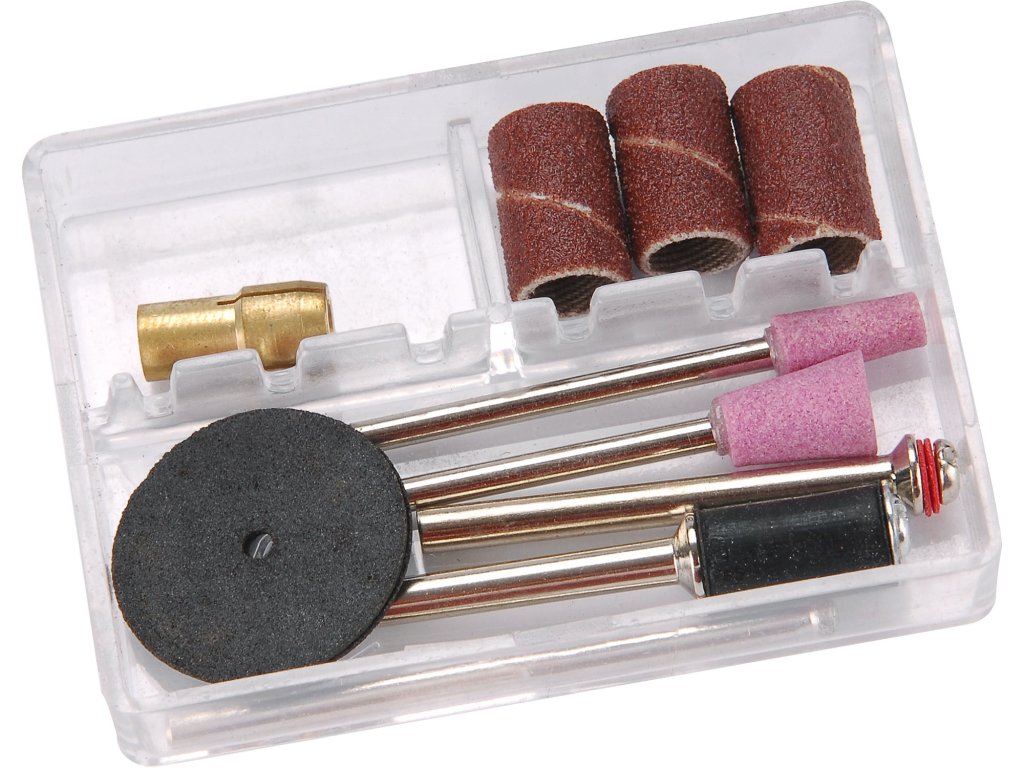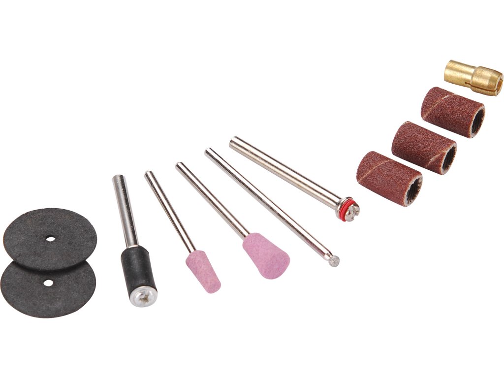 Minibruska je určena k jemnému broušení, odhrotování, frézování, jemnému vrtání a gravírování. Nářadí umožňuje výměnu a montáž upínacích kleštin pro uchycení nástrojů s průměrem stopky 2,3 nebo 3,2mm. Součástí balení je sada 10kusů brusných a řezacích nástrojů a nástavců.