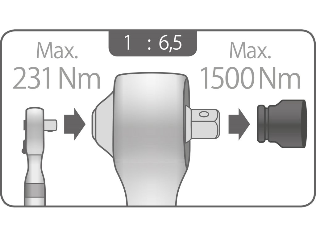 doplňující parametr: | max. výstupní kroutící moment 1500Nm, max. vstupní kroutící moment 231Nm, převodový poměr 1:6,5, vstup 1/2", výstup 3/4", hmotnost sady 6,2kg |