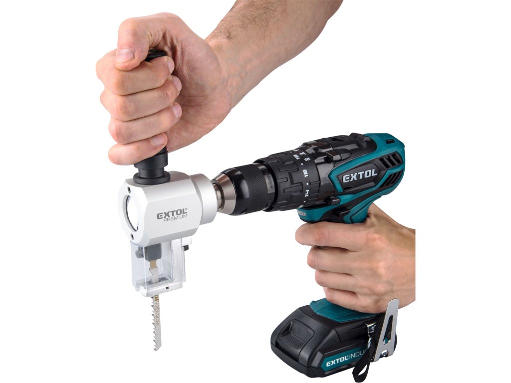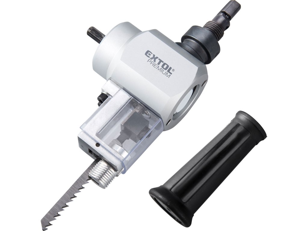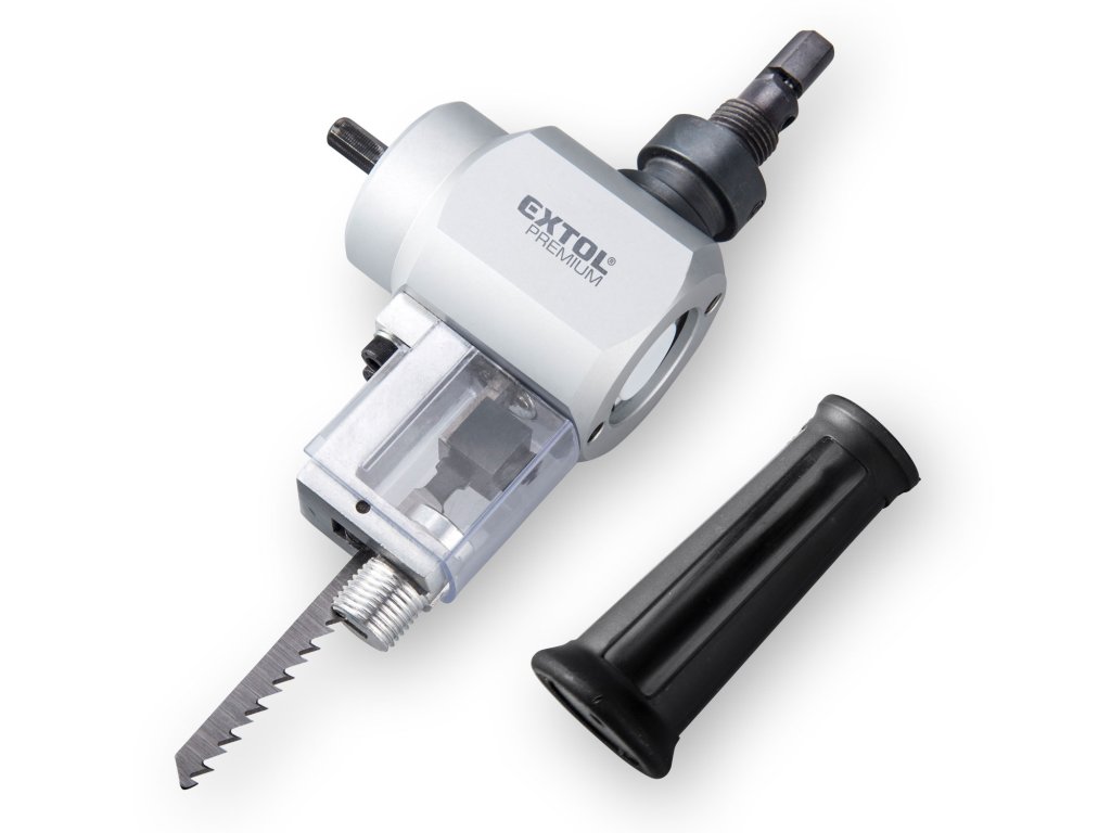 - tento typ nástavce je doplněn o modul pro upnutí pilového plátku a rozšiřuje tak jeho použití o možnost řezání dřeva a plastů až do tl.50mm, oceli a měkkých kovů do tl. 2mm/nerez max. do 0,5mm při doporučených prac. otáčkách optimálně 800 - 1500 ot./min