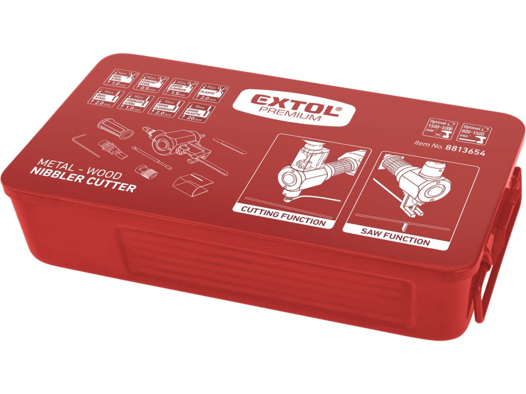 doplňující parametr: | dodáváno v plechové krabičce, balení obsahuje kromě samotného těla nástavce s rukojetí také náhradní střihací hlavu, náhradní stříhací jehlu, adaptér na rukojeť, plátek na kov o délce 75mm, plátek na dřevo o délce 100mm a montážní imbusový klíč (3mm) |