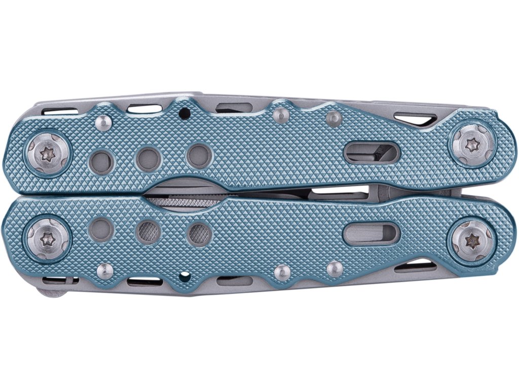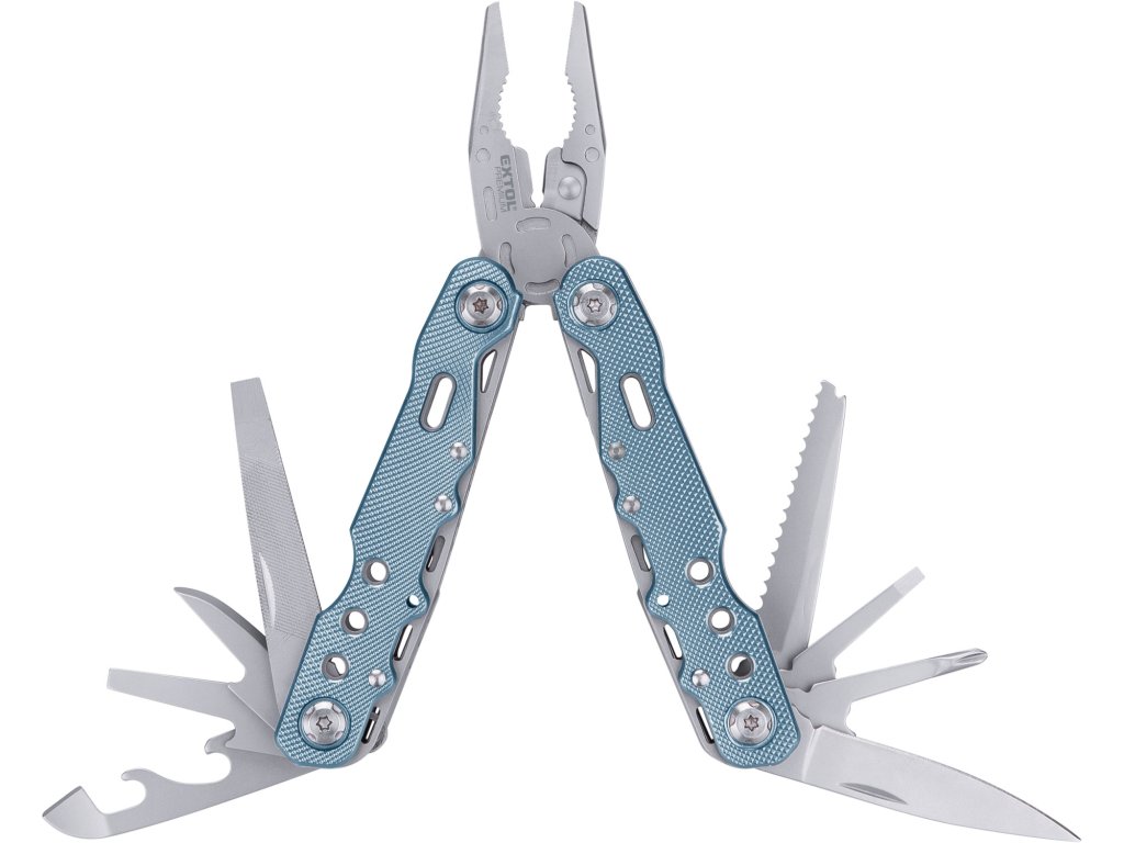 - z nerezové oceli, složení: kleště, pilník+5.5mm plochý šroubovák, pilka, střenka nože, malý nožový bodec,šroubováky PH1+plochý 3mm a 4mm, dva otvíráky (na konzervy+na láhve)