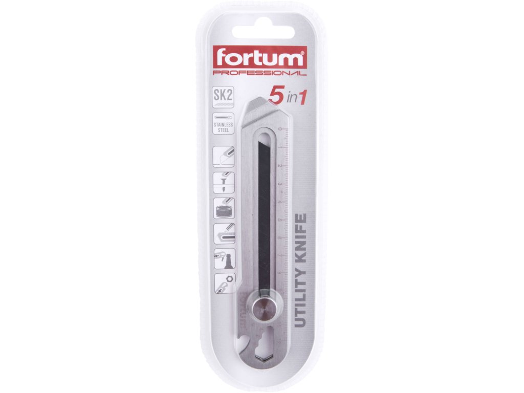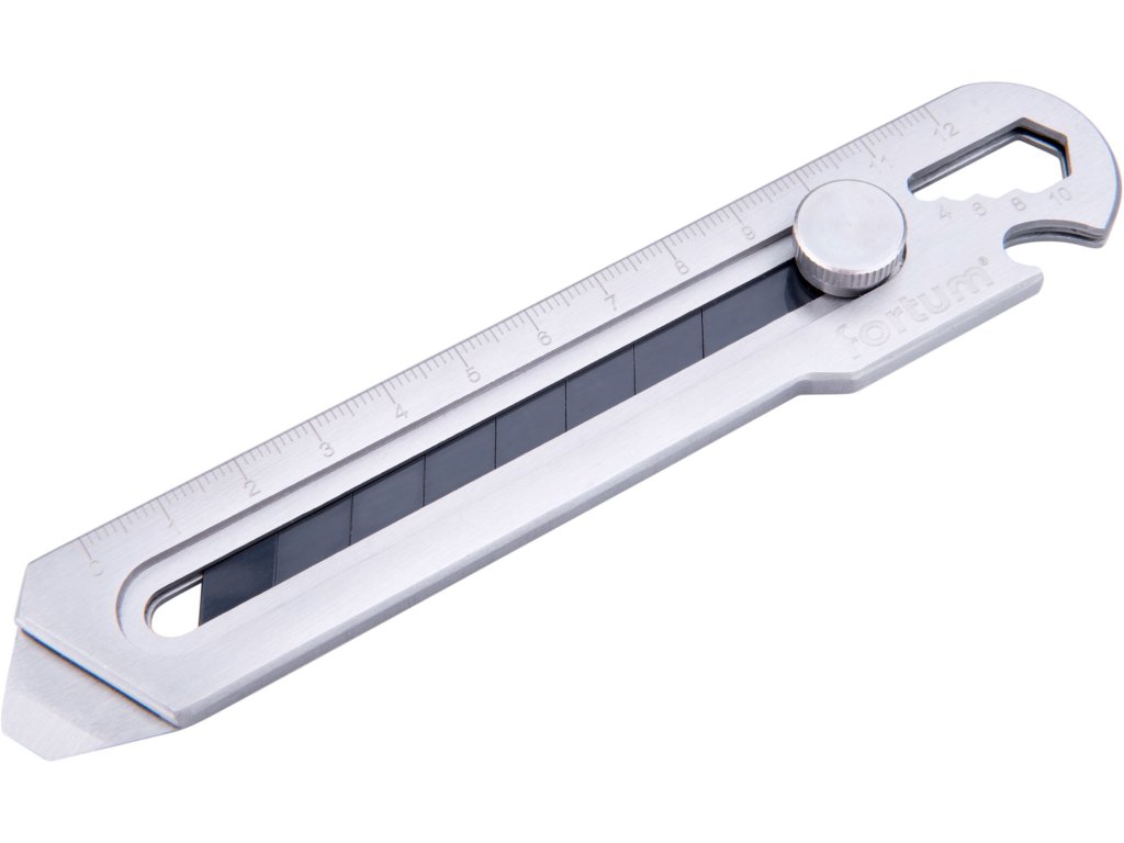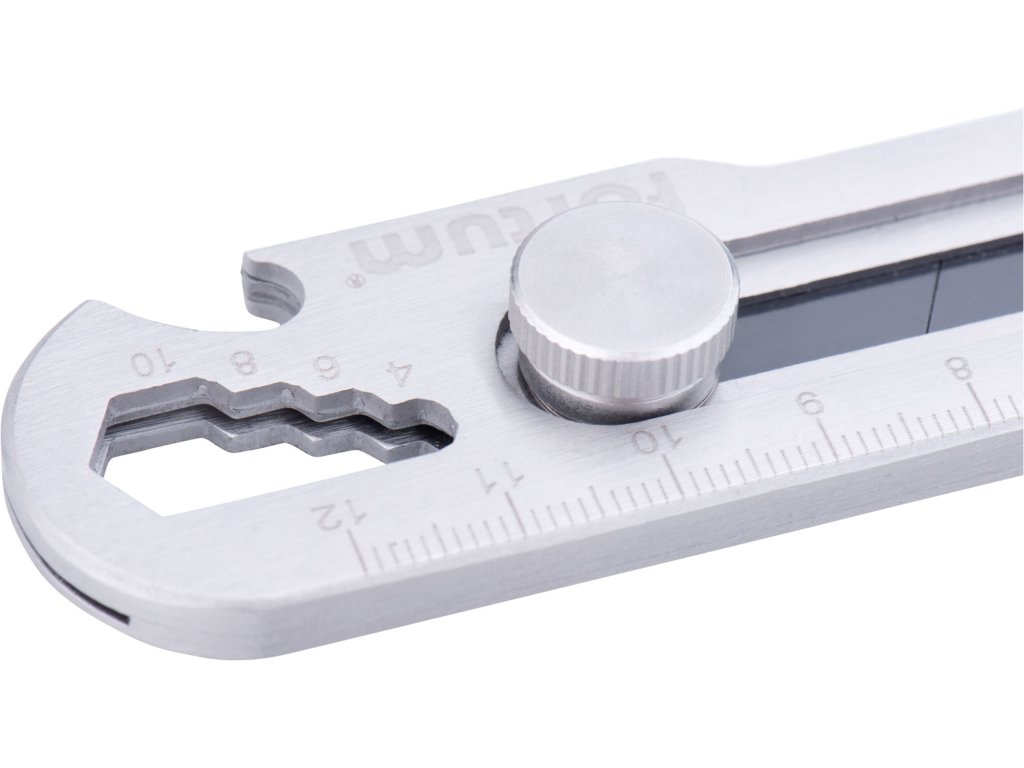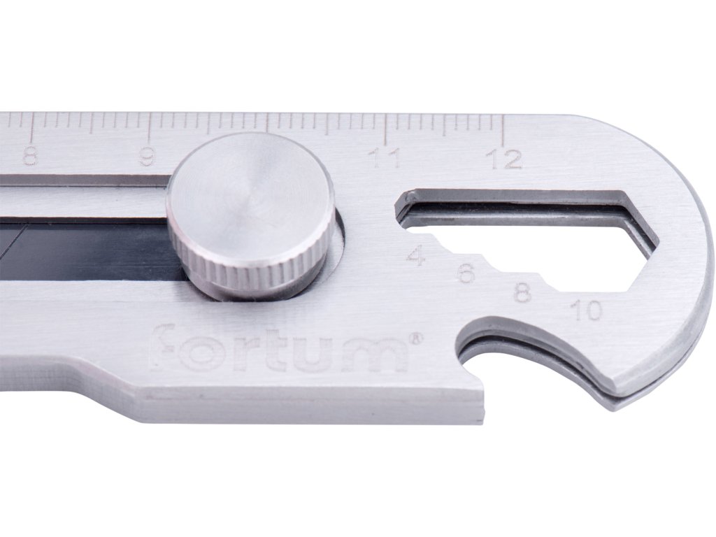 - tělo nože je vyrobeno z nerezové oceli s aretačním kolečkem pro pevnou fixaci břitu ve zvolené poloze; nůž má dále pět přídavných funkcí: měřidlo, otvírák na láhve, plochý šroubovák, klíč na matice 4-6-8-10mm, otvírák/páčidlo plechovek s barvami