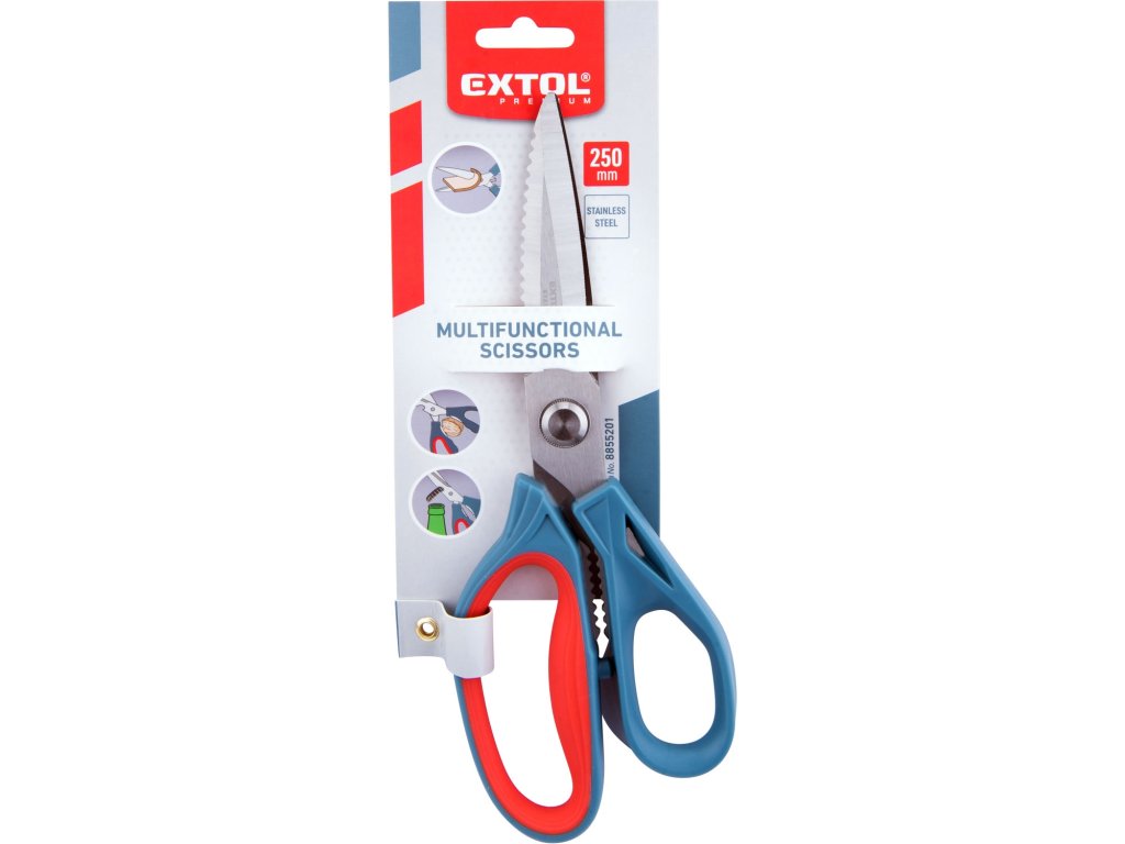 - masivní nerezové nůžky extra pevné konstrukce s polypropylenovými rukojeťmi (velká rukojeť je uvnitř měkčena pryží) a nerezovými čepelemi o tl. 3mm použitelné na stříhání vrstvenného papíru, textilu, kůže, lepenky, provazů, pryže atd.