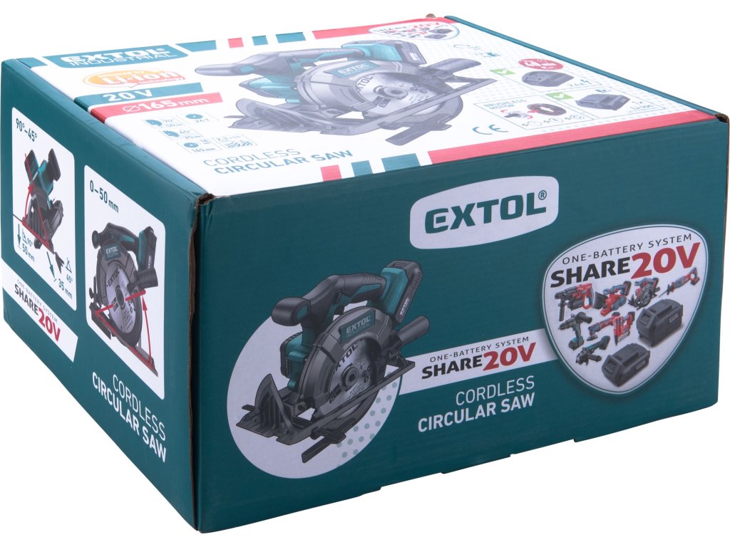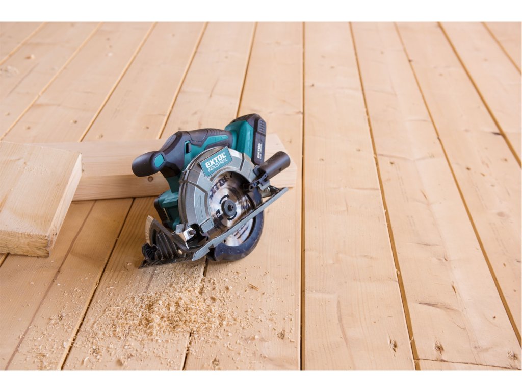 Brushless kotoučová pila je navržena tak, aby uživatelům poskytla výkonné a snadné řezání při různých instalatérských, elektrických, rámovacích, dokončovacích a tesařských pracích. Pila je poháněná nejmodernějším „brushless" motorem s 3650 ot./min umožňuje uživatelům rychle a snadno řezat tvrdým materiálem. Tento nový typ motoru má vyšší životnost, je výkonnější a má menší spotřebu el. energie než klasické motory s uhlíkovými kartáči. Horní a spodní kovový ochranný kryt poskytují vynikající ochranu kotouče při pádu. Gumová měkká rukojeť je ergonomicky navržena tak, aby uživatelům poskytovala vynikající pohodlí a vyvážení pro snadno ovladatelné řezy. Pro běžnou práci dostačují jeden nebo dva 2000mAh akumulátory, které můžete rychle nabít v rychlonabíječce, pro náročnější nebo delší práci doporučujeme větší akumulátory s kapacitou 4000–8000mAh. Akumulátor lze použít ve všech typech nářadí řady EXTOL SHARE20V. Díky použité Li-ion technologii je ho možné kdykoliv dobíjet, aniž by se tím snižovala jeho kapacita. Li-ion akumulátor ztrácí energii vlivem samovybíjení velmi pomalu a vydrží dlouho nabitý a připravený k použití.