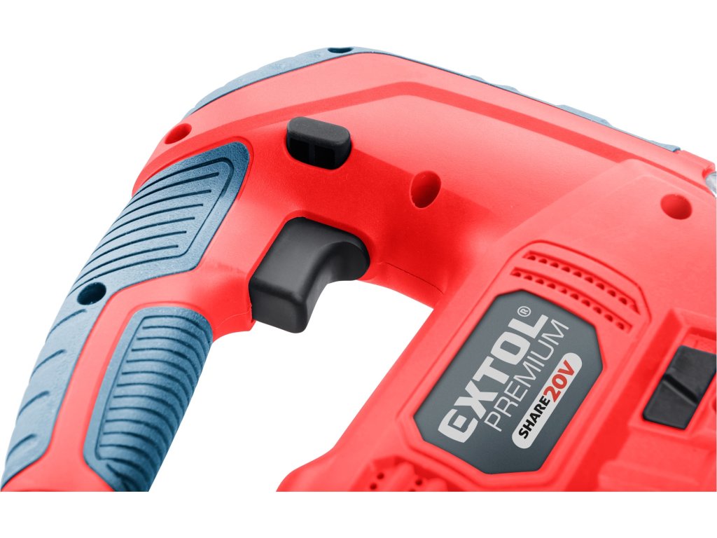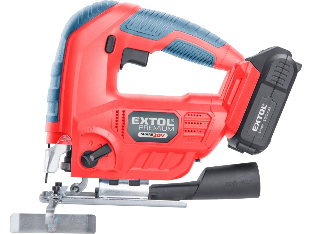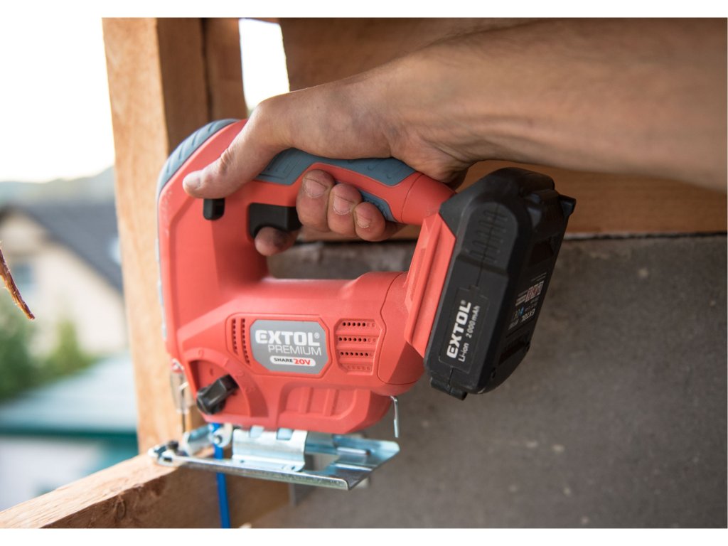 Aku přímočará pila SHARE20V je určena k provádění dělících a tvarových řezů, zejména do dřeva a dřevotřísky a k řezání kovů, plastu, keramických desek a gumy, dále sádrokartonu, cementotřískového materiálu. Díky rychloupínacímu systému lze pilový plátek „Bosch“ vyměnit bez použití nástrojů. Lze použít plátek jakéhokoliv výrobce s tímto úchytem. Standartně při řezání pila odfukuje piliny z místa řezání, ale pokud k ní připojíte vysavač, můžete tento odfuk přepnout a piliny přímo odsávat do vysavače, čímž dosáhnete mnohem čistějšího pracovního místa. Při řezání sádrokartónu a podobných materiálů s velmi jemným prachem je nutno vždy používat odsávání vysavačem. Při práci můžete regulovat rychlost kmitů pomocí spínače a také můžete nastavit sílu předkmitu. Obě nastavení se používají pro změnu stylu a rychlosti řezání v odlišných materiálech. Pro snadnější práci má pila LED světlo osvětlující pracovní místo, které se automaticky zapíná při stisku spínače. Gumová vrstva pokrývající pilu v místě úchopu snižuje množství vibrací, které se přenášejí do rukou a snižuje únavu při práci. Pro běžnou práci dostačují jeden nebo dva 2000mAh akumulátory, které můžete rychle nabít v rychlonabíječce, pro náročnější nebo delší práci doporučujeme větší akumulátory s kapacitou 4000–8000mAh. Akumulátor lze použít ve všech typech nářadí řady EXTOL SHARE20V. Díky použité Li-ion technologii je ho možné kdykoliv dobíjet, aniž by se tím snižovala jeho kapacita. Li-ion akumulátor ztrácí energii vlivem samovybíjení velmi pomalu a vydrží dlouho nabitý a připravený k použití.
