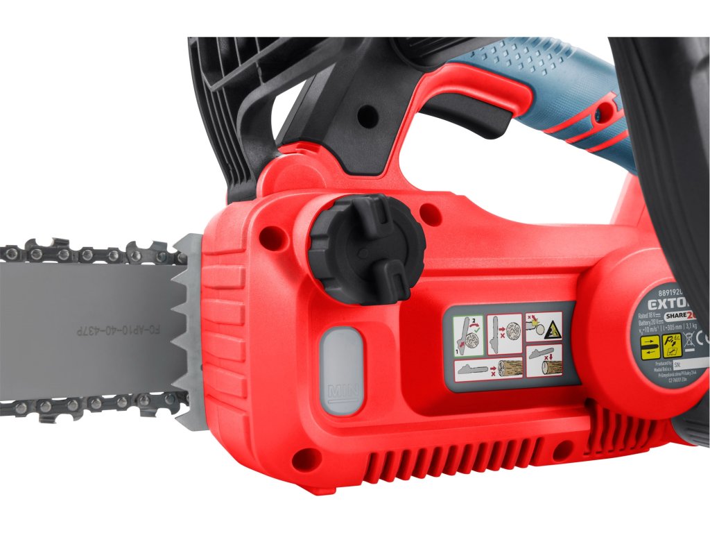 Řetězová aku pila je určena k provádění zkracovacích řezů dřeva, jako je např. řezání trámů, kácení stromů s přiměřeně silným kmenem, k odvětvování kmenů, k řezání kmenů či silných větví na palivové dřevo. Aku řetězová pila spojuje výhody elektrických pil — nízký hluk, jednoduchost obsluhy a údržby se svobodou pohybu u benzínových pil. Je vybavena kvalitní vodící lištou a pilovým řetězem. Mazaní řetězu za chodu je automaticky zajišťováno čerpadlem. Pohon zajišťuje nejmodernější „brushless" motor. Tento nový typ motoru má vyšší životnost, je výkonnější a má menší spotřebu el. energie než klasické motory s uhlíkovými kartáči. Vysoký výkon brushless motoru se velmi dobře využije při zpracování dřeva, kdy dovoluje chod pily i při rychlejším řezání. Pila je také vybavena systémem pro snadnou a rychlou výměnu řetězu a mechanismem pro jednoduché vypnutí řetězu. Vysokou bezpečnost zajišťuje bezpečnostní pojistka, která se aktivuje při vyklouznutí z rukou nebo při “kopnutí” pily a elektronickou doběhovou brzdou, která zajistí jeho rychlé zastavení. Pogumovaná rukojeť brání vysmeknutí, tlumí vibrace a zpříjemňuje držení při práci. Na spodní straně pily je otvor pro jednoduché zavěšení na zeď. Akumulátor je vybaven ukazatelem nabití, což umožňuje uživateli si rozvrhnout délku práce a dát si včas nabít další akumulátor. Pro běžnou práci dostačují jeden nebo dva 2Ah akumulátory, které můžete rychle nabít v rychlonabíječce, pro náročnější nebo delší práci doporučujeme větší akumulátory s kapacitou 4–8Ah. Akumulátor lze použít ve všech typech nářadí řady EXTOL SHARE20V. Díky použité Li-ion technologii je ho možné kdykoliv dobíjet, aniž by se tím snižovala jeho kapacita. Li-ion akumulátor ztrácí energii vlivem samovybíjení velmi pomalu a vydrží dlouho nabitý a připravený k použití.