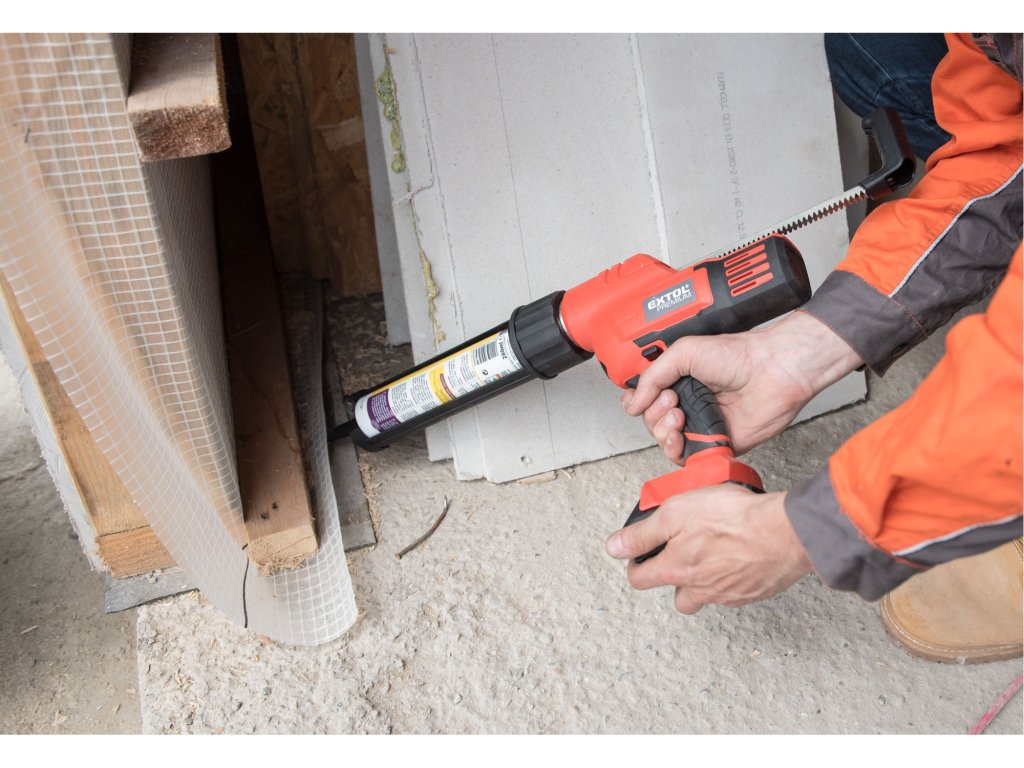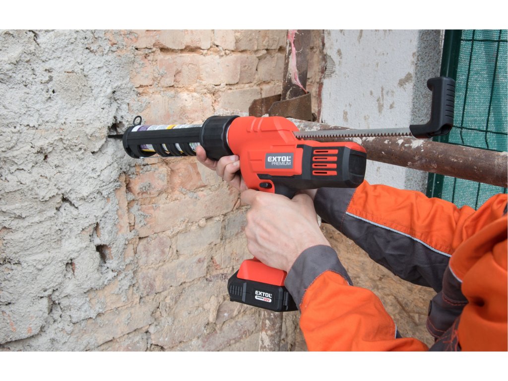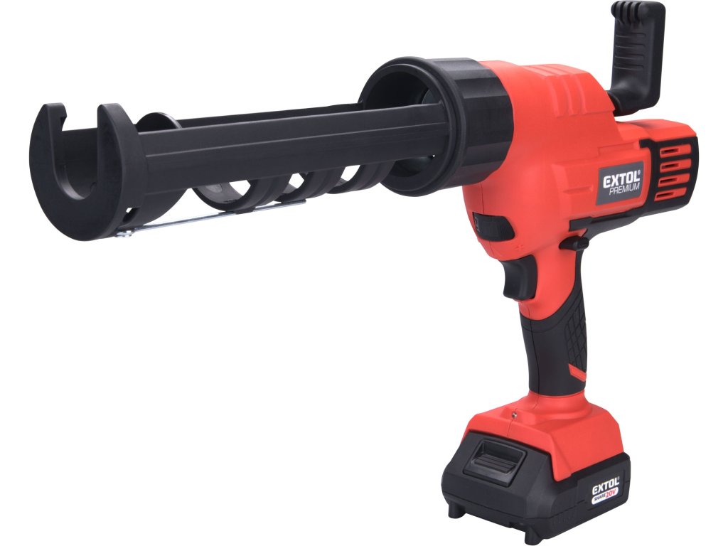 Aku vytlačovací vaničková pistole je určena k vytlačování silikonu, chemických kotev apod. z kartuší. Rychlost posuvu lze nastavit na 6polohovém regulátoru v rozsahu 50-560mm/min, což umožňuje přesnou regulaci toku hmoty. Silný motor a převody vyvinou tlak až 2000N tlačné síly. Pistole má funkci ANTI-DRIP, která po zastavení pistole automaticky popojede nazpátek a díky tomuto uvolnění tlaku v tubě, nepokračuje vytlačování hmoty. Pro zrychlení práce není zpětný chod motorizovaný, ale jen rychle povytáhnete píst. Vaničku je možno otočit v rozsahu 360°. Stroj je vybaven ochrannou proti přetížení. Rukojeť je pokryta měkkou protiskluzovou gumou, která snižuji vibrace a dobře se drží. Přímo nad baterií je umístěno osvětlení, které osvětluje pracovní místo. Pro běžnou práci dostačují jeden nebo dva 2000mAh akumulátory, které můžete rychle nabít v rychlonabíječce, pro náročnější nebo delší práci doporučujeme větší akumulátory s kapacitou 4000–8000mAh. Akumulátor lze použít ve všech typech nářadí řady EXTOL SHARE20V. Díky použité Li-ion technologii je ho možné kdykoliv dobíjet, aniž by se tím snižovala jeho kapacita. Li-ion akumulátor ztrácí energii vlivem samovybíjení velmi pomalu a vydrží dlouho nabitý a připravený k použití.