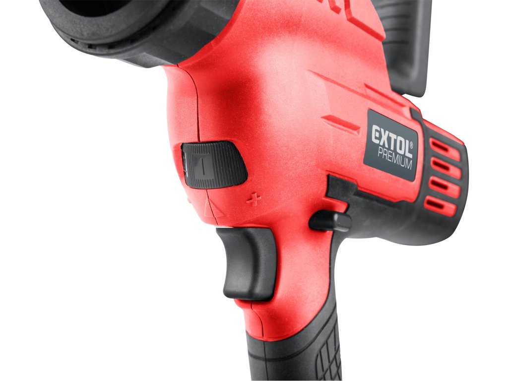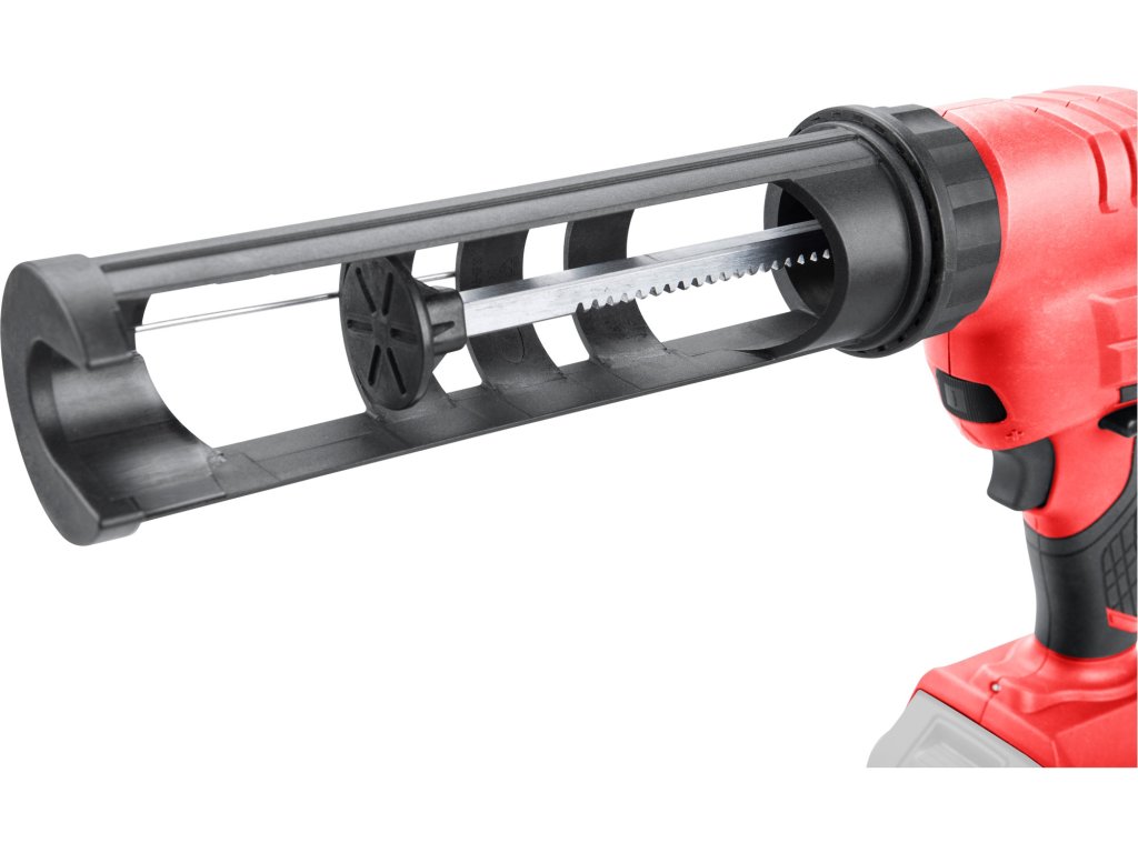 Aku vytlačovací vaničková pistole je určena k vytlačování silikonu, chemických kotev apod. z kartuší. Rychlost posuvu lze nastavit na 6polohovém regulátoru v rozsahu 50-560mm/min, což umožňuje přesnou regulaci toku hmoty. Silný motor a převody vyvinou tlak až 2000N tlačné síly. Pistole má funkci ANTI-DRIP, která po zastavení pistole automaticky popojede nazpátek a díky tomuto uvolnění tlaku v tubě, nepokračuje vytlačování hmoty. Pro zrychlení práce není zpětný chod motorizovaný, ale jen rychle povytáhnete píst. Vaničku je možno otočit v rozsahu 360°. Stroj je vybaven ochrannou proti přetížení. Rukojeť je pokryta měkkou protiskluzovou gumou, která snižuji vibrace a dobře se drží. Přímo nad baterií je umístěno osvětlení, které osvětluje pracovní místo. Pro běžnou práci dostačují jeden nebo dva 2000mAh akumulátory, které můžete rychle nabít v rychlonabíječce, pro náročnější nebo delší práci doporučujeme větší akumulátory s kapacitou 4000–8000mAh. Akumulátor lze použít ve všech typech nářadí řady EXTOL SHARE20V. Díky použité Li-ion technologii je ho možné kdykoliv dobíjet, aniž by se tím snižovala jeho kapacita. Li-ion akumulátor ztrácí energii vlivem samovybíjení velmi pomalu a vydrží dlouho nabitý a připravený k použití.