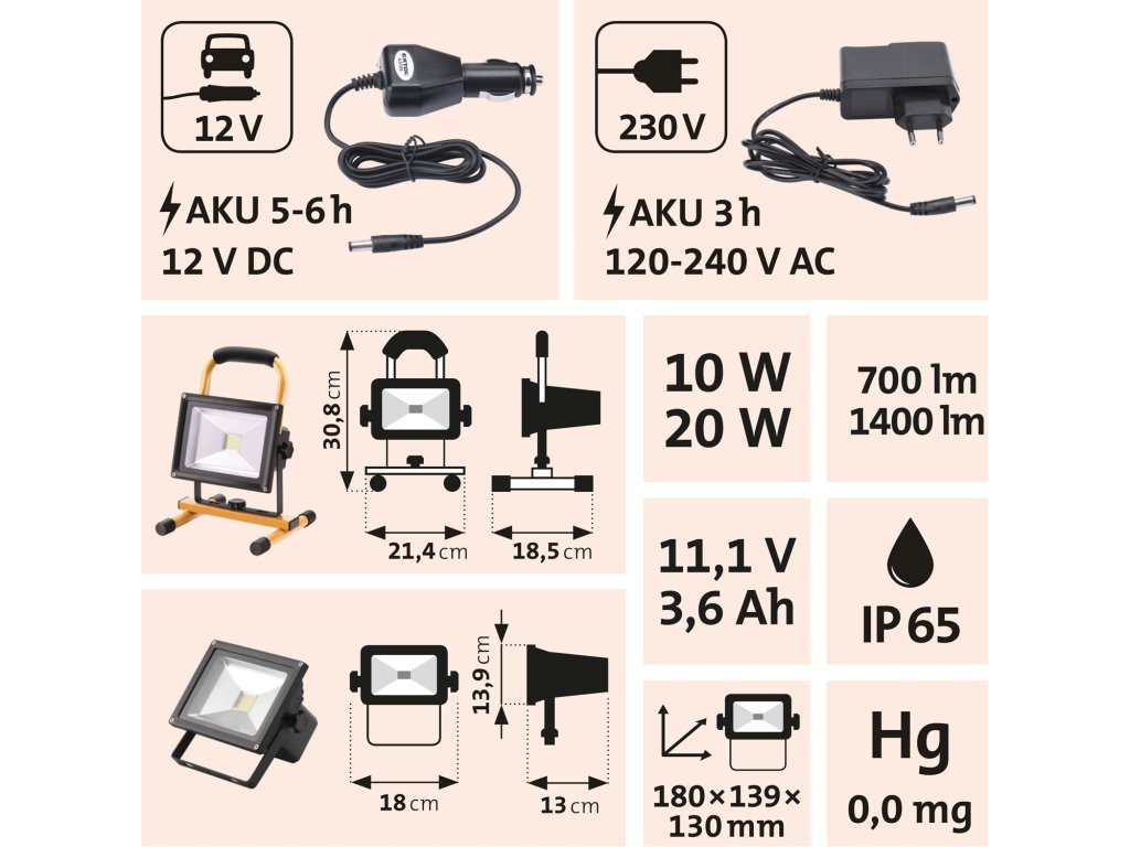 | doba svitu na plný výkon: | 6h (10W) / 4h (20W) |