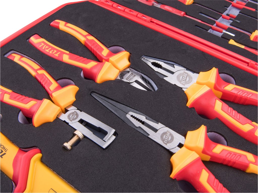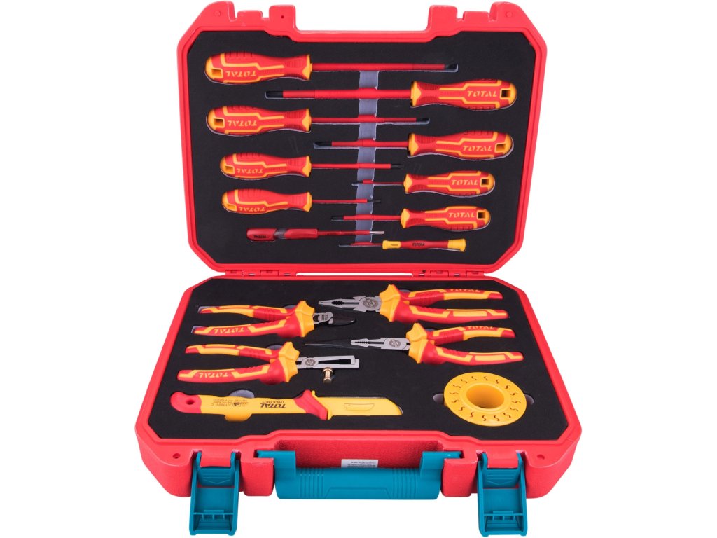 Sada 16ks elektrikářského nářadí je vložena do červeného kufru z tvrzeného PVC. Všechny komponenty nářadí jsou držitely certifikací 1000V,VDE/GS. Nářadí je v kufru vloženo do výřezů z tvrdé pěny, který je specifický pro každý typ nářadí. Víte tedy přesně, kam po dokončení práce co uložit. V pěnové výplni je elegantně vyřešeno vyndávání nářadí. Pro šroubováky je uprostřed otvor pro prst a úchop přední strany šroubováku, pro kleště je po stranách otvor pro palec a ukazováček. Sada obsahuje tyto druhy nářadí: 1ks 200mm elektrikářské kombinované kleště, 1ks 200mm elektrikářské přímé kleště, 1ks 160mm elektrikářské boční štípací kleště, 1ks 160mm elektrikářské kleště na odizolování kabelů, 4ks elektrikářské šroubováky přímé SL3x75mm, SL4.0x100mm;,SL5.5x125mm, SL6.5x150mm, 5ks elektrikářských šroubováků křížových PH00x50mm, PH0x60mm, PH1x80mm, PH2x100mm, PH3x150mm, 1ks 30x70mm zkoušečky napětí, 1ks 50x180mm nůž na kabely, 1ks elektrikářské vinylové pásky Baleno v kufru