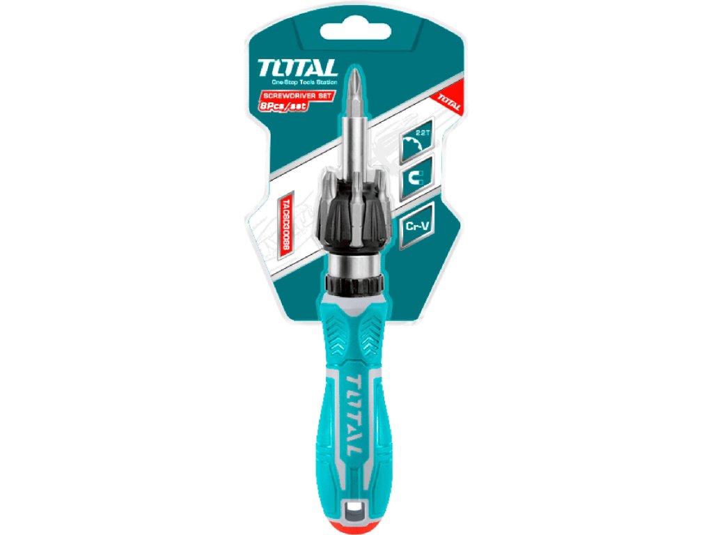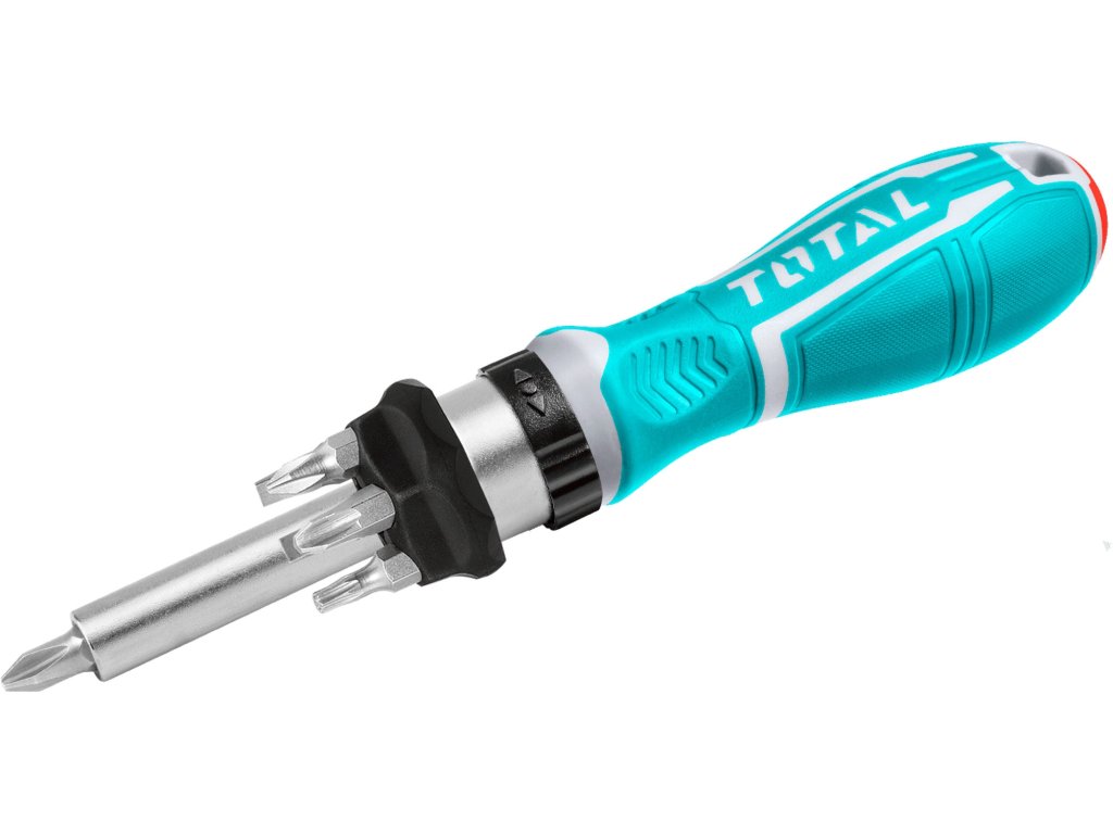 Ráčnový šroubovák pro snadnou práci se 7 hroty. Pro snadnou výměnu jsou umístěny v blízkosti úchytu hrotů.