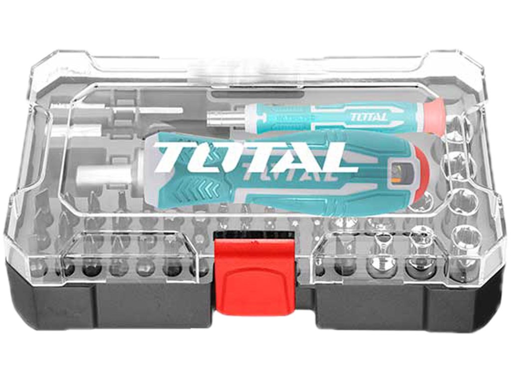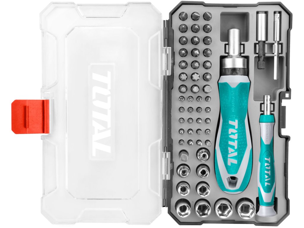 Kombinováná sada řáčnového šroubováku s 21ks hrotů a 9ks ořechů společně s hodinářským šroubovákem s 20ks hrotů.