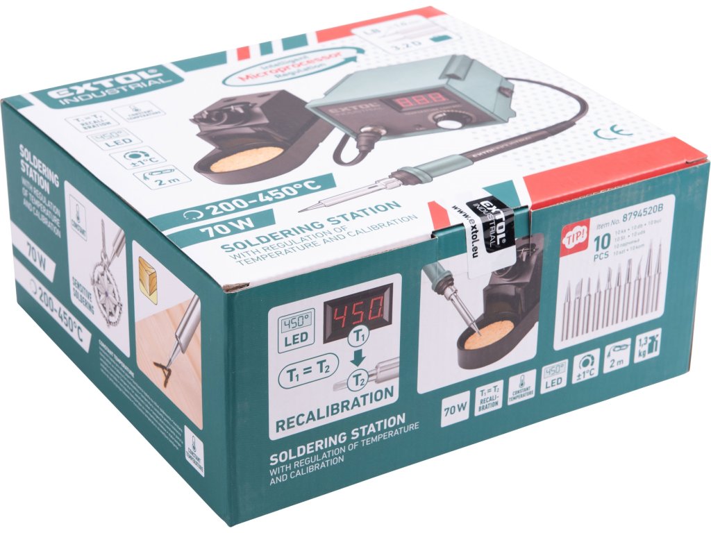 Výkonná mikroprocesorová pájecí stanice s teplotním rozsahem 200-450°C, s LCD displejem a jemnou regulací teploty ±1°C je určena pro profesionální použití při pájení vyžadujícím preciznost a přesnou regulaci teploty pájení – zejména v elektronice a bižuterii, kde se neklade přílišný požadavek na odolnost vůči mechanickému namáhání, ale na přesnost provedení. Pájecí stanice zajišťuje velice rychlé vyhřátí pájecího hrotu na nastavenou teplotu. Mikroprocesorová elektronika neustále snímá teplotu pájecího hrotu a okamžitě reaguje na změny teploty (+/-) čímž udržuje konstantní teplotu, aniž by docházelo k teplotním výkyvům, což je důležité pro pájení citlivých součástek. V případě použití jiného typu pájecího hrotu lze zjištěný rozdíl mezi dosaženou teplotou na hrotu a nastavenou teplotou na displeji vyrovnat funkcí rekalibrace.