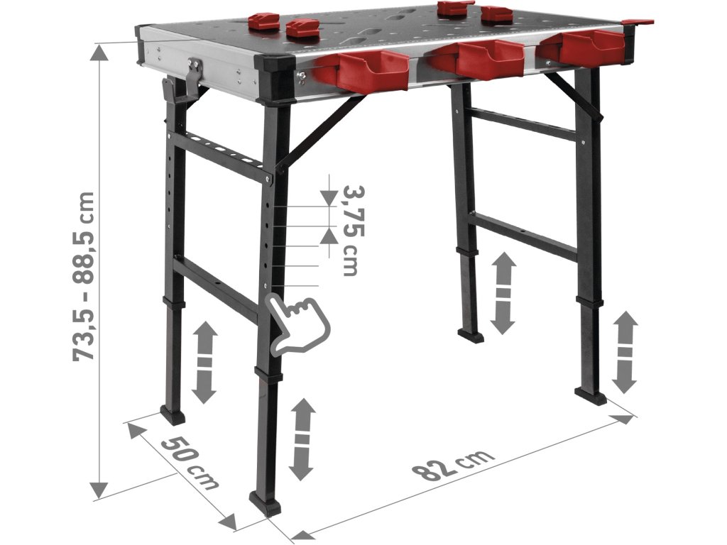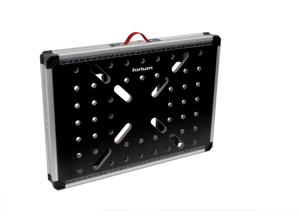 Pracovní lehce přenosný stůl FORTUM vám poskytne výškově nastavitelnou pracovní plochu o rozměrech 850x600mm z MDF materiálu s množstvím výřezů pro vymezovací/opěrné zarážky nebo úpínací svěrky. Nosnost stolu je 450kg . Tento stůl lze pomocí 2ks odnímatelných bočních úchytů spojit a zafixovat s dalším stolem nebo mezi dva tyto stoly na dvojici trámkových dřevěných profilů nainstalovat libovolně dlouhou pracovní desku
