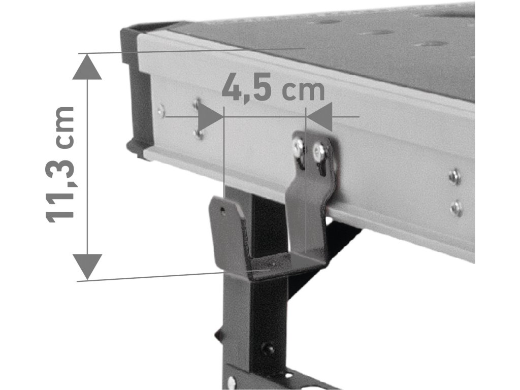 - tento stůl lze pomocí 2ks odnímatelných bočních úchytů o šířce 55mm spojit a zafixovat s dalším stolem nebo mezi dva tyto stoly na dvojici trámkových dřevěných profilů nainstalovat libovolně dlouhou pracovní desku