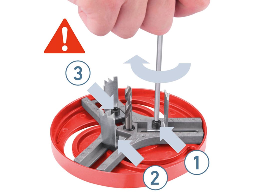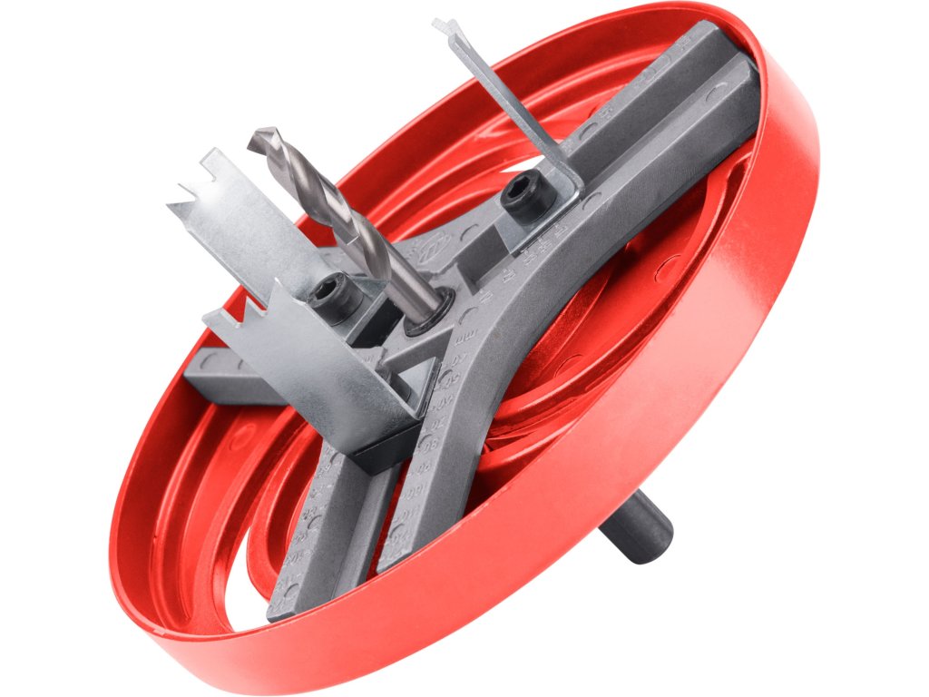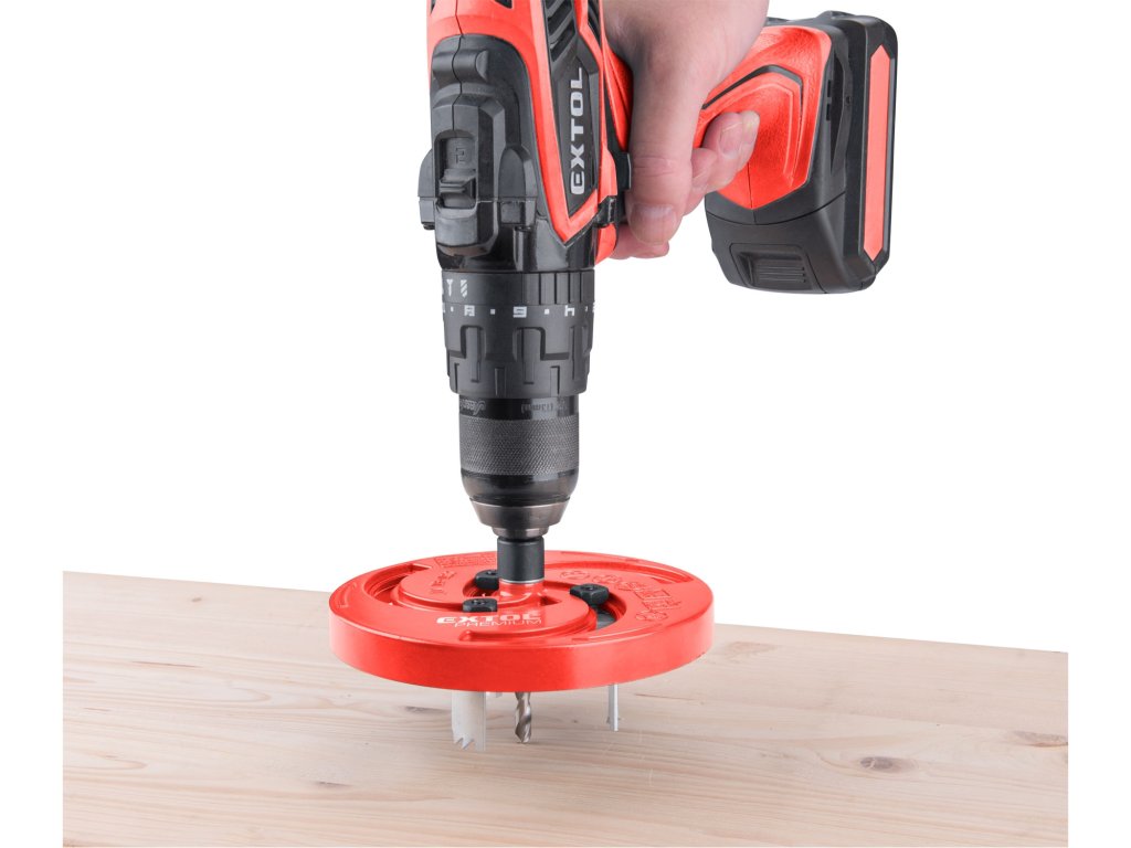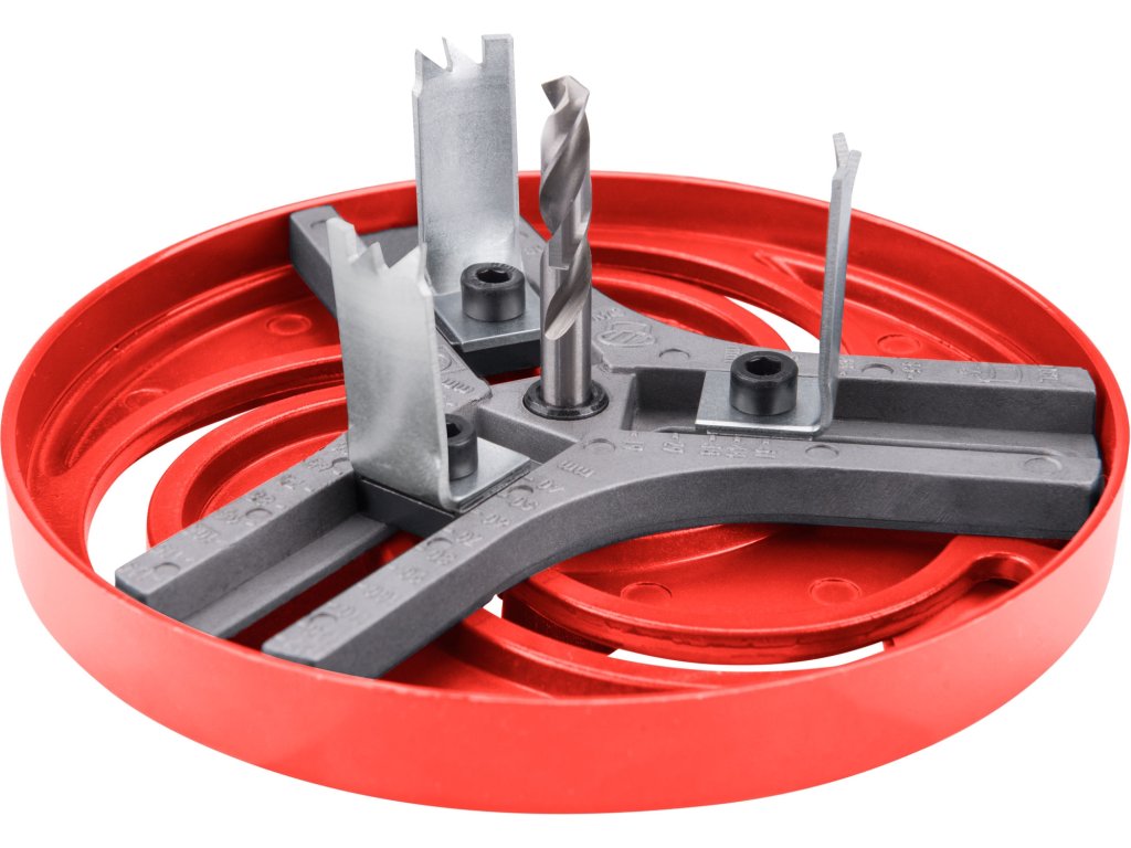 - unašeč je osazen stopkou O9mm se třemi 3fazetami pro uchycení do vrtačky; vykružovací korunka umožňuje prořez materiálem do hloubky max. 27mm
