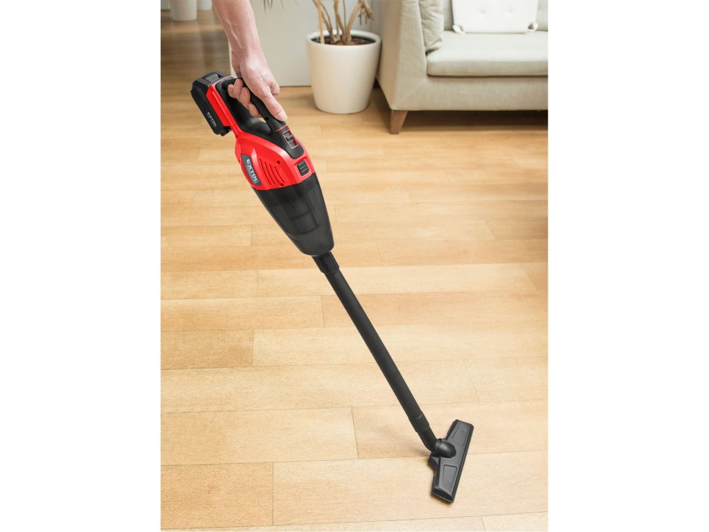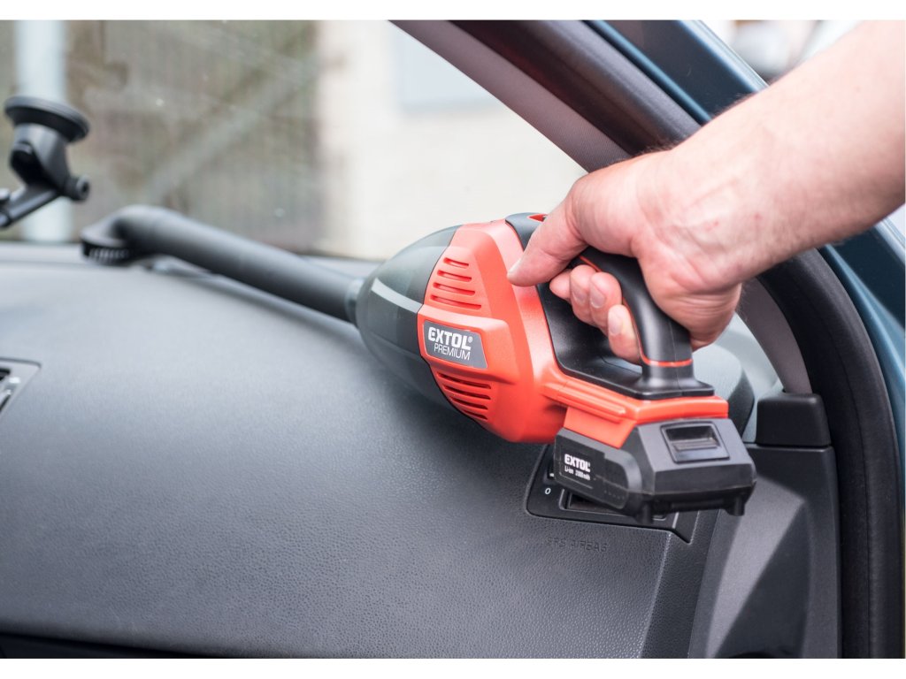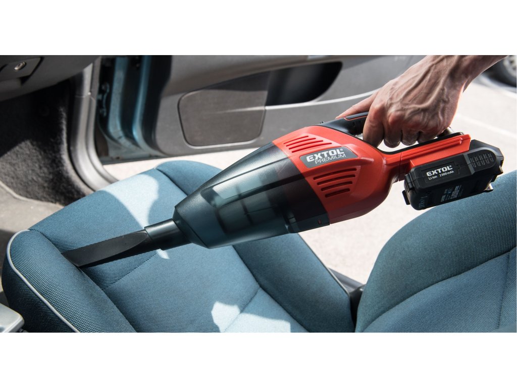 Aku vysavač je určen k suchému vysávání v domácnosti nebo v autě a je ideální pro menší úklidové práce, kvůli kterým se vám nechce rozbalovat elektrický vysavač. Je dodáván s podlahovou koncovkou a prodlužovací sací trubkou pro vysávání podlahy, vysávací koncovkou s kartáčem, úzkou hubici a ohebnou hadicí. Díky bezsáčkovému provedení odpadá potřeba opakovaného dokupování sáčků. Nádoba na prach je jednoduše oddělitelná od těla vysavače stisknutím jediného tlačítka. Nádobu pak stačí pouze vysypat a nasadit zpět. Její objem postačuje pro rutinní úklid. Důležitou součástí vysavače je filtrace. Vysavač má síťový předfiltr a jemný HEPA filtr s vysokou filtrační účinností. Síťový předfiltr chrání jemný HEPA filtr před zanesením hrubým prachem a většími částicemi. Díky své vysoké filtrační účinnosti je tento filtr vhodný zejména pro alergiky. Zanesený HEPA filtr, síťový předfiltr nebo zásobní nádobku na prach lze omýt tekoucí vodou. Přiložená hadice je vynikající, pokud je třeba vysávat ve stísněných prostorech (např. auto), s její pomocí se dostanete úplně všude. Pro běžnou práci dostačují jeden nebo dva 2000mAh akumulátory, které můžete rychle nabít v rychlonabíječce, pro náročnější nebo delší práci doporučujeme větší akumulátory s kapacitou 4000–8000mAh. Akumulátor má indikátor nabití a lze použít ve všech typech nářadí řady EXTOL SHARE20V. Díky použité Li-ion technologii je ho možné kdykoliv dobíjet, aniž by se tím snižovala jeho kapacita. Li-ion akumulátor ztrácí energii vlivem samovybíjení velmi pomalu a vydrží dlouho nabitý a připravený k použití.