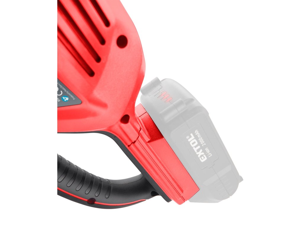 Aku vysavač je určen k suchému vysávání v domácnosti nebo v autě a je ideální pro menší úklidové práce, kvůli kterým se vám nechce rozbalovat elektrický vysavač. Je dodáván s podlahovou koncovkou a prodlužovací sací trubkou pro vysávání podlahy, vysávací koncovkou s kartáčem, úzkou hubici a ohebnou hadicí. Díky bezsáčkovému provedení odpadá potřeba opakovaného dokupování sáčků. Nádoba na prach je jednoduše oddělitelná od těla vysavače stisknutím jediného tlačítka. Nádobu pak stačí pouze vysypat a nasadit zpět. Její objem postačuje pro rutinní úklid. Důležitou součástí vysavače je filtrace. Vysavač má síťový předfiltr a jemný HEPA filtr s vysokou filtrační účinností. Síťový předfiltr chrání jemný HEPA filtr před zanesením hrubým prachem a většími částicemi. Díky své vysoké filtrační účinnosti je tento filtr vhodný zejména pro alergiky. Zanesený HEPA filtr, síťový předfiltr nebo zásobní nádobku na prach lze omýt tekoucí vodou. Přiložená hadice je vynikající, pokud je třeba vysávat ve stísněných prostorech (např. auto), s její pomocí se dostanete úplně všude. Pro běžnou práci dostačují jeden nebo dva 2000mAh akumulátory, které můžete rychle nabít v rychlonabíječce, pro náročnější nebo delší práci doporučujeme větší akumulátory s kapacitou 4000–8000mAh. Akumulátor má indikátor nabití a lze použít ve všech typech nářadí řady EXTOL SHARE20V. Díky použité Li-ion technologii je ho možné kdykoliv dobíjet, aniž by se tím snižovala jeho kapacita. Li-ion akumulátor ztrácí energii vlivem samovybíjení velmi pomalu a vydrží dlouho nabitý a připravený k použití.