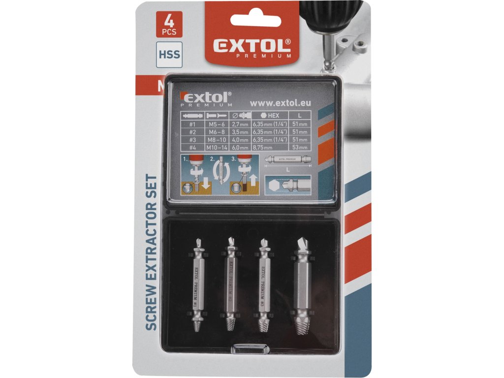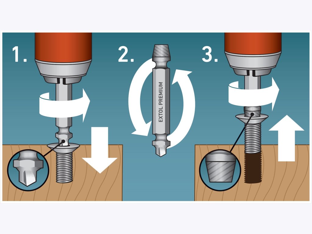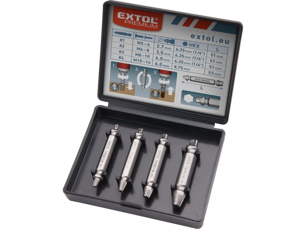 - unikátní tvar vytahováků, vrtáky pro předvrtání otvorů ve šroubech a vytahováky v jedné sadě
